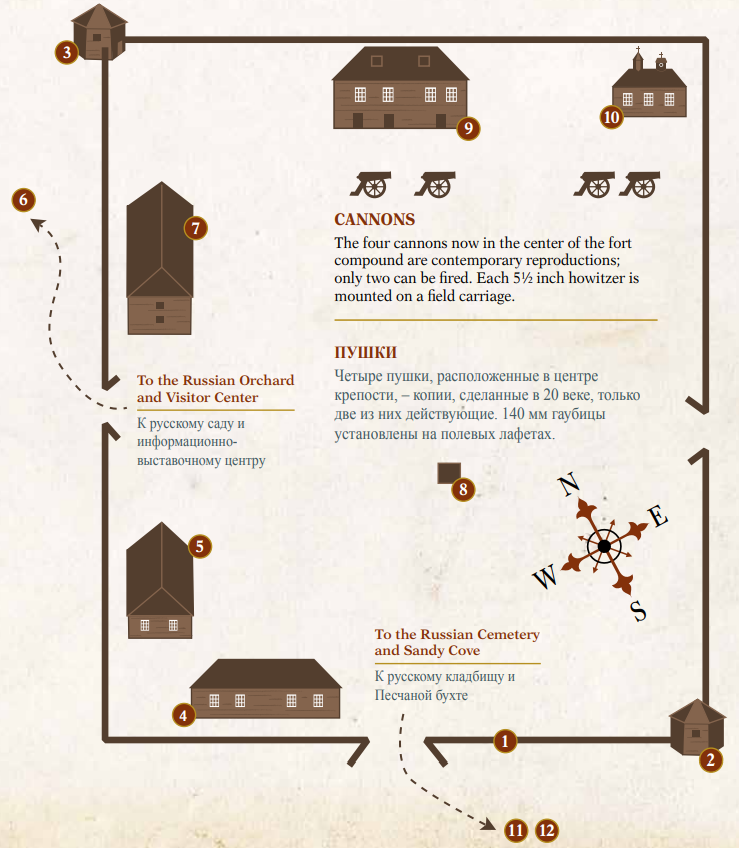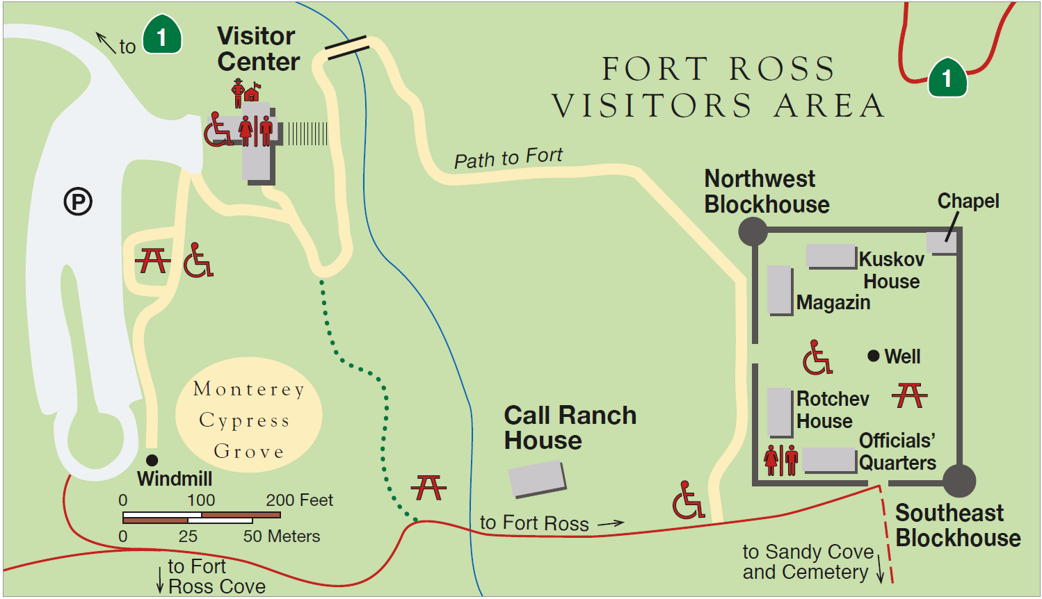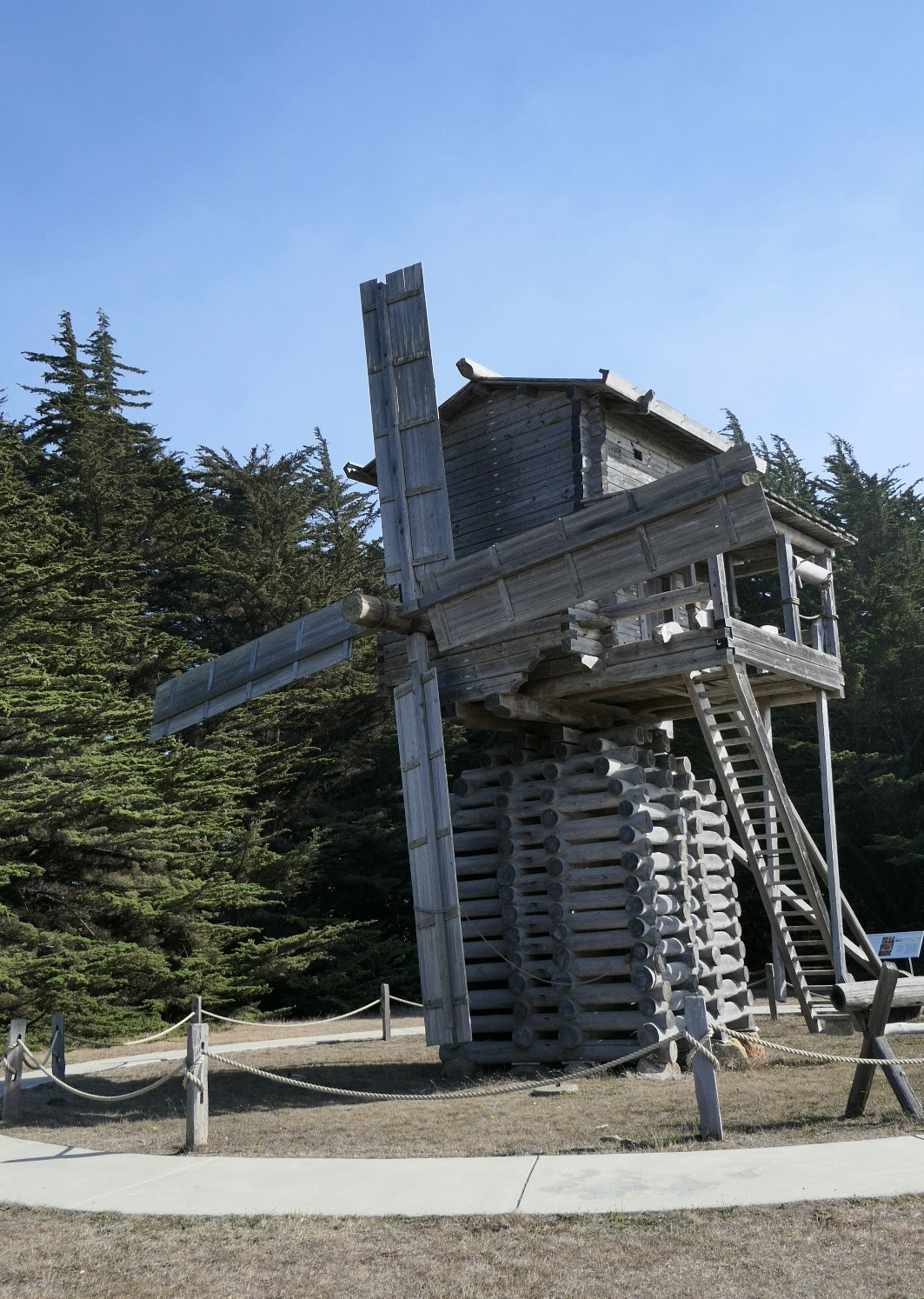Fort Ross Historic Park은 러시아 이주민들이 세웠던 요새를 역사공원으로 제정한 곳이다. 18세기 중엽에 러시아는 Alaska 및 북태평양 연안의 북미대륙에 진출하기 시작하였다. 18세기 말에 Russian-American Company라는 이름으로 본격적으로 전술한 지역의 식민지 확장에 나섰다. 1812년에 세워진 Fort Ross는 그 중 가장 남쪽에 위치해 있었으며 Alaska에 필요한 물자 공급기지의 역할을 맡았다. 이곳에는 California 최초의 풍차와 조선소가 세워졌으며 러시아 과학자들이 태평양 연안 북가주의 지리와 해리, 동식물, 날씨, 조류(潮流) 등에 관한 많은 연구 자료를 남겼다. 당시 러시아에서 비싸게 팔리던 물개가죽을 구하기 위해 물개를 남획하여 씨가 마를 정도가 되었다는 기록도 있다. 1841년에 Russian-American Company는 요새를 팔아 넘긴 후 몇 차례 그 주인이 바뀌었으며, 1906년에 California가 이 일대를 매입하고 1909년에 역사공원으로 세웠다. California 최초의 풍차는 없어졌지만 2012년에 있었던 Fort Ross 200주년을 기념하여 러시아의 한 문화역사 재단에서 복제품을 기증하여 주차장 끝에 설치되어 있다.
