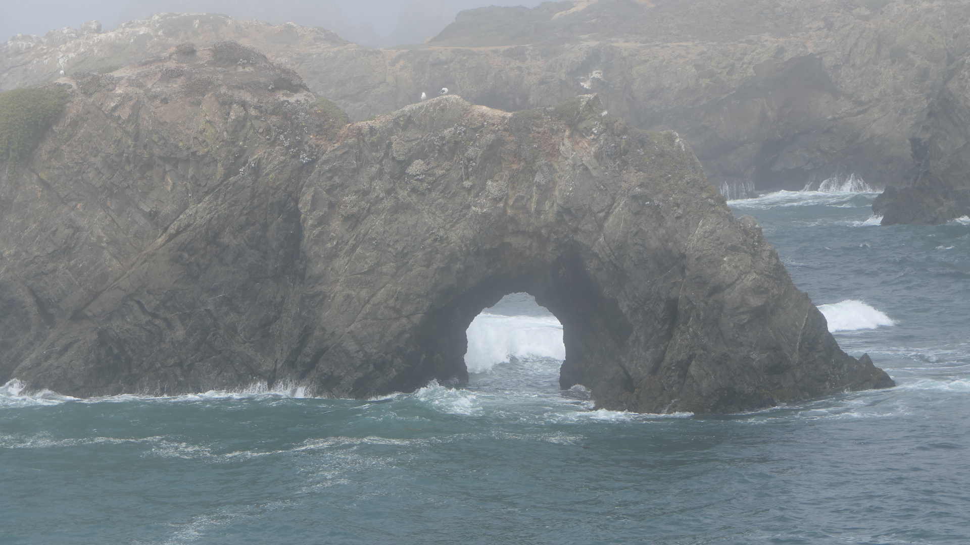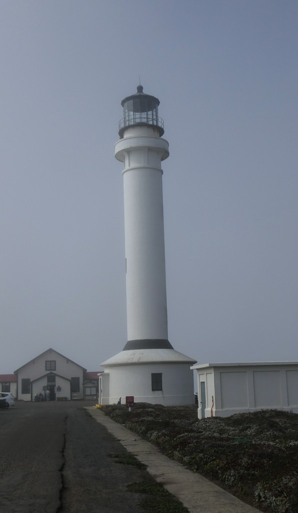Point Arena Lighthouse는 높이가 115 feet(35 m)로 미국 서부해안에서 가장 높은 등대이다. 이 등대는 1870년에 세워졌는데 1906년 지진으로 피해가 심해 철거하고 다시 지어 1908년에 재가동되었다. 석유등불을 일종의 프리즘 렌즈로 초점을 맞추던 이 등대는 여러 번의 개조를 거쳐 LED, 안개경고 경적기는 radio beacon 등의 첨단 장비로 발전하였다. 마침 몰려든 안개로 뿌연 사진이 되고 말았다.