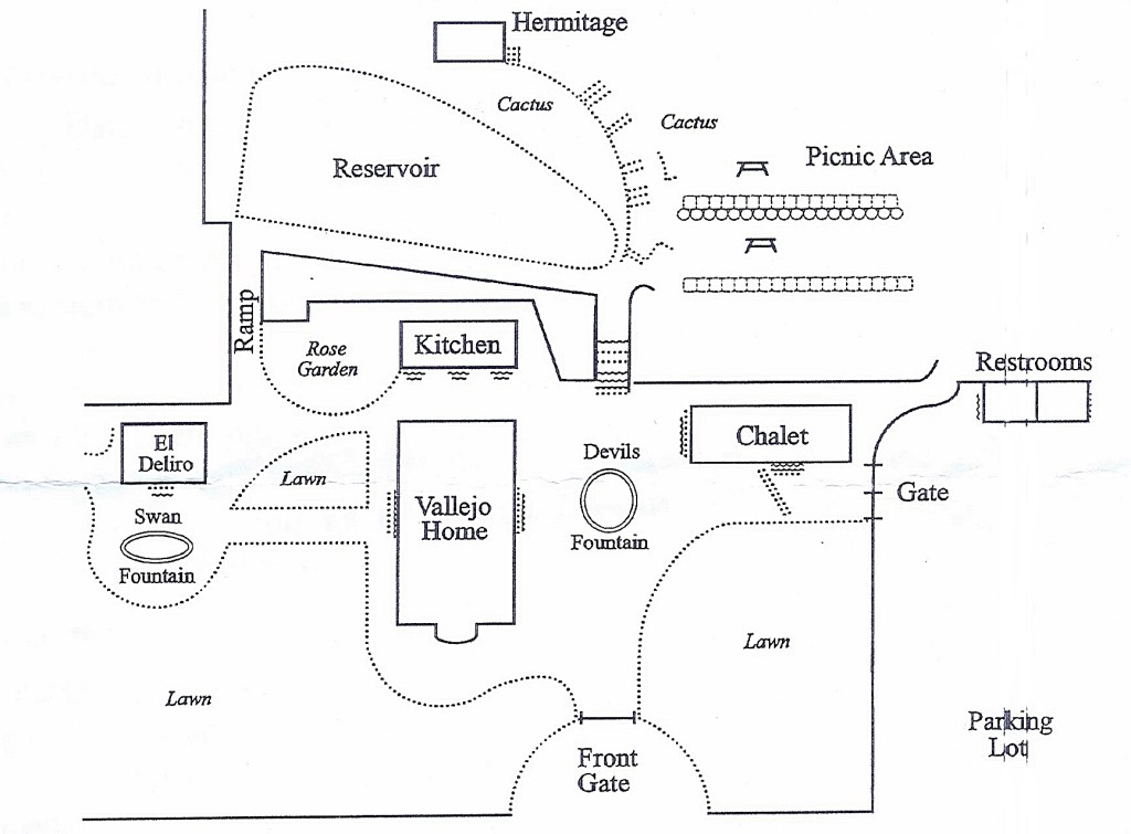 Spain St으로 계속 서쪽으로 가다 3rd St. W에서 오른쪽으로 올라가면 Vallejo의 저택이었던 Lachryma Montis가 있다. 이 일대를 원주민들은 Chiucuyem이라 불렀는데 crying mountain이라는 뜻으로 언덕에 있는 샘물을 지칭한 것이다. Vallejo는 자신의 저택을 Lachryma Montis이라 명명하였는데 라틴어로 tears of mountain이라는 뜻으로 원주민들이 부르던 이름을 유지하려 했다. Vallejo와 그의 가족들은 여기서 1890년까지 살았다. 2층인 본채 건물은 동부에서 설계하여 부분적으로 만들어서 배로 남미를 돌아 운반하여 현 위치에 지어졌다. Chalet로 불리는 2층 건물은 포도주, 채소, 과일 등을 저장하기 위하여 지어졌고 목재와 벽돌은 유럽에서 수입한 것이었다.
