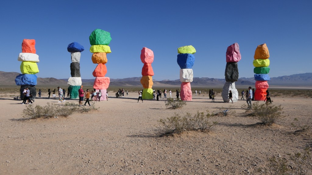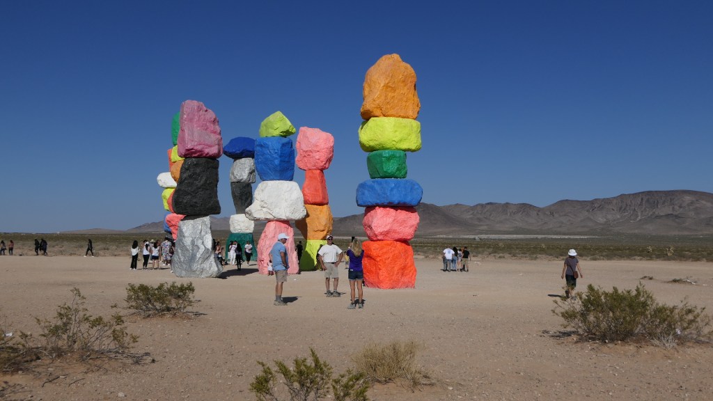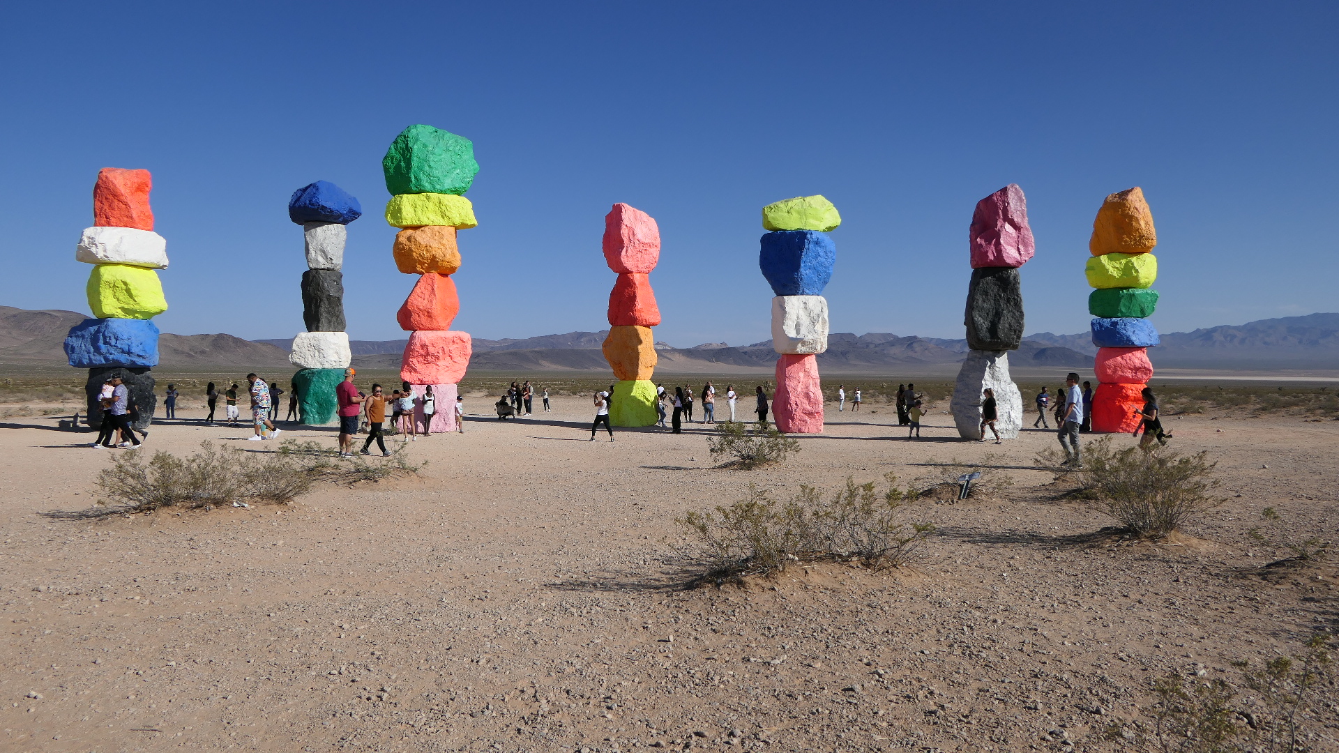 Seven Magic Mountains는 세계적으로 유명한 스위스의 예술가 Ugo Rondinone의 대형설치예술 작품이다. 색을 칠하여 색깔과 모양이 다른 바위들을 쌓아서 만든 7개의 기둥들을 사막 한 가운데에 설치한 것인데 제작에 약 6개월이 걸렸다 한다. 우선 큰 바윗돌들을 골라 현재 전시된 곳으로 옮기고, 자르고, 구멍을 뚫고, 쌓고 철근으로 연결하고 색칠하는 순으로 작업이 진행되었다. 2016년 5월애 일반에게 공개되었고 그 후 2년간 전시할 계획이었다. 그런데 방문객들이 예상 외로 많아 2021년 말까지 전시가 예정되어 있다. 이 곳에 영구 전시될 것이라는 소문도 있다 한다.
