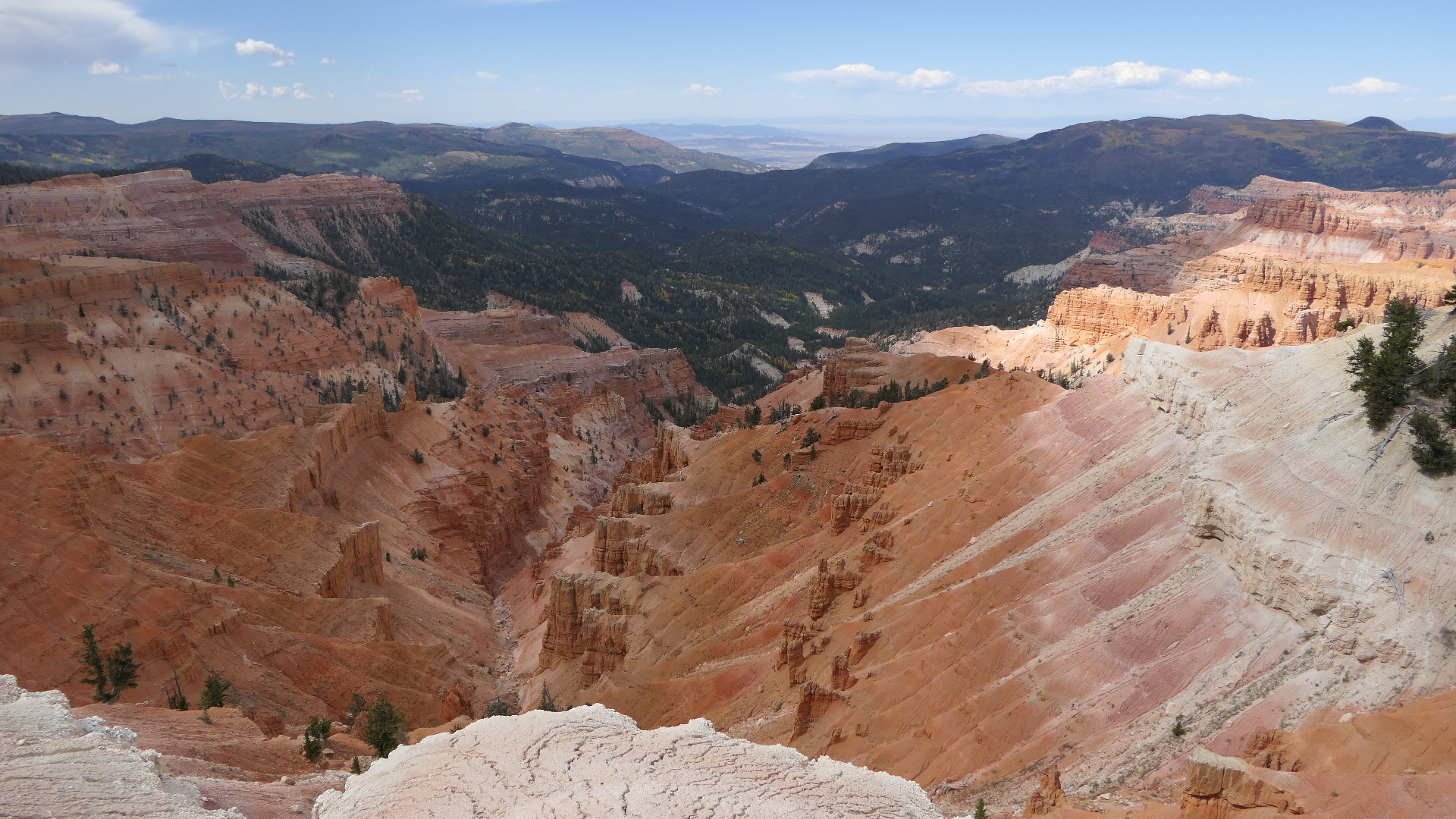 해발 10,000 feet(3,048 m)가 넘는 고지에 있는 Cedar Breaks National Monument는 약 3 mile(4.8 Km)에 걸친 깊이 2,000 ft (610 m) 정도의 계곡이 유명하다. 이런 형태의 계곡은 그 모양에 연유하여 원형경기장(amphitheater)이라고 불린다. 지질학자들의 연구에 의하면 이 일대는 아주 오래 전에 호수였는데 그 바닥에 석회암(limestone), 사암(sandstone), 그리고 혈암(shale, 頁岩, 진흙 등의 작은 입자로 구성된 일종의 퇴적암) 들이 쌓여 있었다고 한다. 약 2천8백만년 전에 대 폭발로 일대의 지각에 큰 변동이 일어나며 일종의 고원이 형성되었다. 세월이 흐르며 석회암, 사암, 혈암들이 풍화작용으로 침식되며 현재의 계곡이 생겨났다. 계곡은 현란한 붉은 계통의 색을 띠고 있는데 이는 암석들에 철분과 마그네시아 성분이 여러 비율로 섞여 있기 때문이다. 그래서 일대에 살던 원주민들은 이 계곡을 ‘Circle of Painted Cliffs’라고 불렀다 한다.