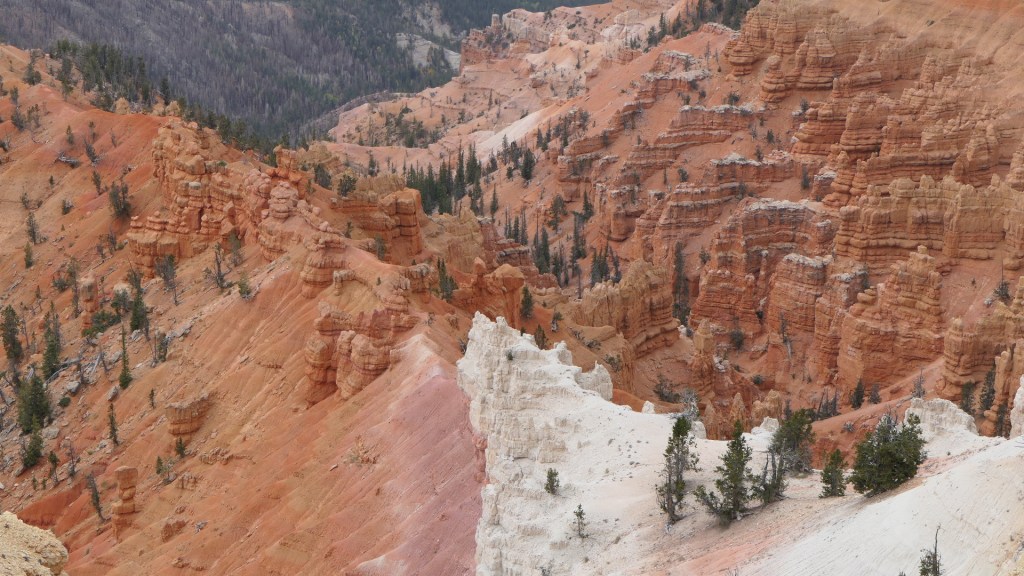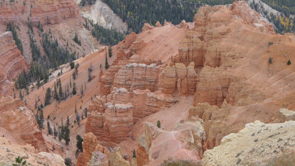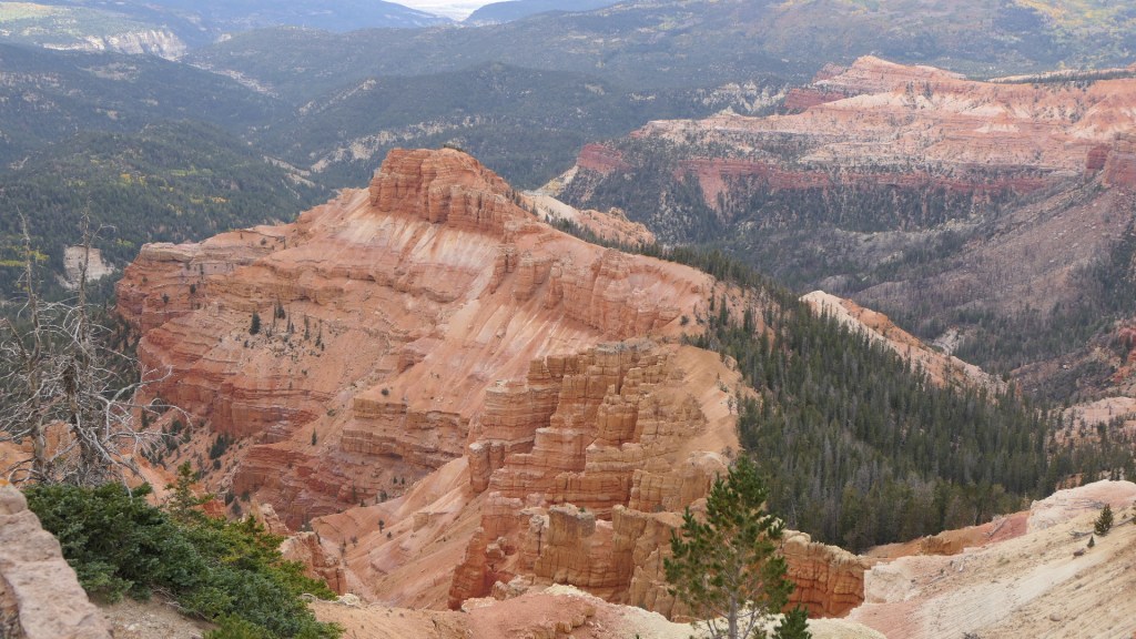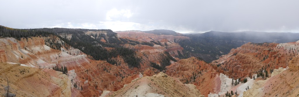 Cedar Breaks National Monument는IDA(International Dark-Sky Association)에 의해 International Dark Sky Park으로 지정되었다. 현재 전 세계에 총 180군데가 Community, Park, Reserve, Sanctuary, Place로 분류되어 지정되었는데 ‘빛의 공해’로부터 청정지역으로 밤하늘을 자연 그대로 감상할 수 있는 곳이다. Cedar Breaks National Monument는 보통 11월부터 5월사이에 적설량에 따라 일반 차량의 통행이 금지된다. 이 공원에는 모두 4군데의 전망대가 있다 – Point Supreme Overlook, Sunset View Overlook, Chessmen Ridge Overlook, North View Overlook. 이 곳으로 가는 길은 하나, UT-148번으로 남쪽에서 올라가면 앞에 소개한 순서대로 전망대가 나온다. Hiking Trail도 왕복 0.6 mile부터 5 mile까지 4개가 있지만 우리는 전망대만 들리기로 하였다. 우리가 갔을 때 Point Supreme Overlook은 공사로 인해 개방되지 않고 있었다. Sunset View Overlook에 있는 picnic area에서 점심을 먹는데 눈이 내리기 시작하였다. 곧 멎어서 다행이었는데 고도가 있으니 날씨가 제법 쌀쌀하다. 눈앞에 펼쳐진 정교한 지형의 거대한 계곡과 신비스러운 색깔에 감탄사를 연발하며, 사진 작가들은 최적의 햇살을 기다린다지만, 우리는 갈 길을 재촉하였다.
