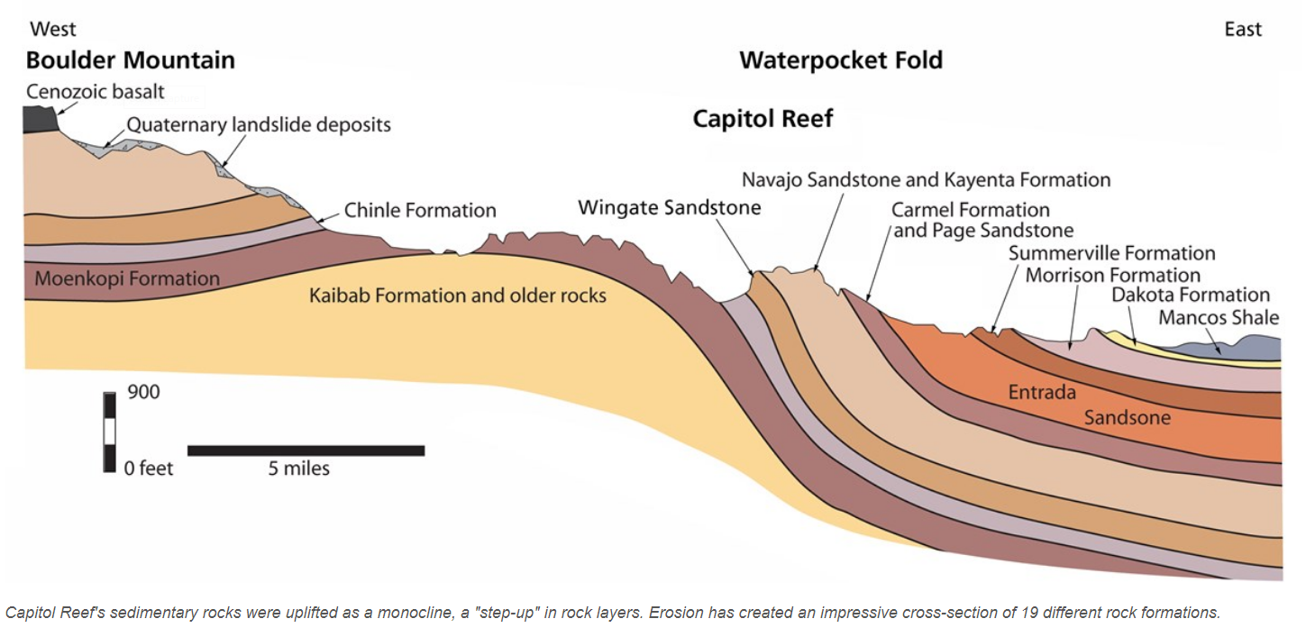 약 2억5천만년 전에 Capitol Reef 일대는 바다, 호수, 습지와 사막이 있었다. 오랫동안 이 일대에, Cedar Breaks와 마찬가지로, 석회암(limestone), 사암(sandstone), 그리고 혈암(shale) 등이 쌓이게 된다. 약 7천만년전과 5천만년전 사이에 대 폭발이 있었고 지각의 변동이 발생하며 Waterpocket Fold가 형성되었다. Waterpocket Fold는 Utah주 남동쪽에 약 100 mile(160 Km)에 걸쳐서 형성되어 있는데 여러 지층들이 서쪽이 동쪽보다 약 7,000 feet (2134 m) 더 높게 같은 방향으로 기울어진(monocline) 지질대를 일컫는다. 여기에 풍화작용으로 침식이 일어나며 현재의 Capitol Reef가 형성되었다.
