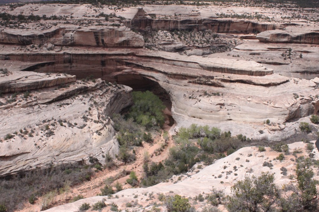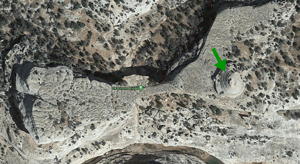 마지막으로 나오는 다리는 Owachomo Bridge이다. 여기 있는 다리 중 가장 작은 다리이다. Owachomo는 Hopi 말로 돌더미라는 뜻인데 다리 동쪽 끝 윗부분에 있는 원추형의 바위에서 유래한 이름이다 – 아래 Google Map satellite view 오른쪽에 보이는 원추형 바위. 밑에서 다리만 보다 이런 비밀은 놓치고 말았다.