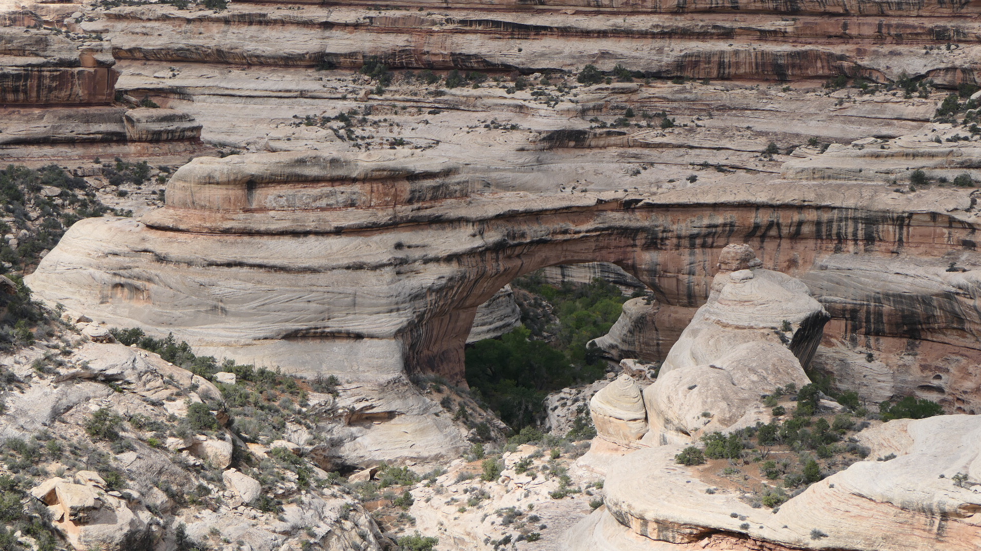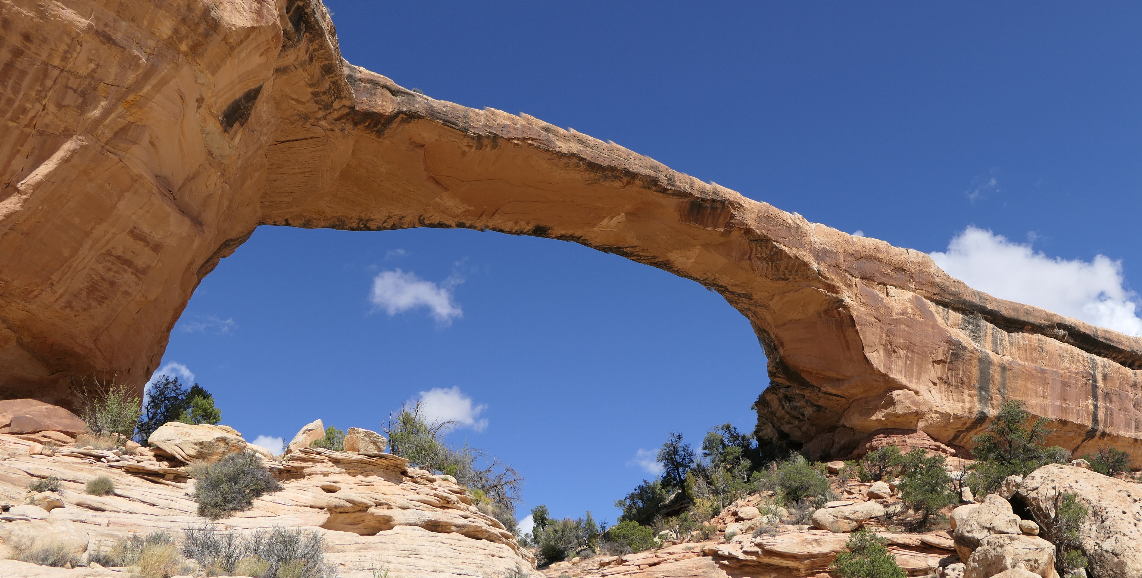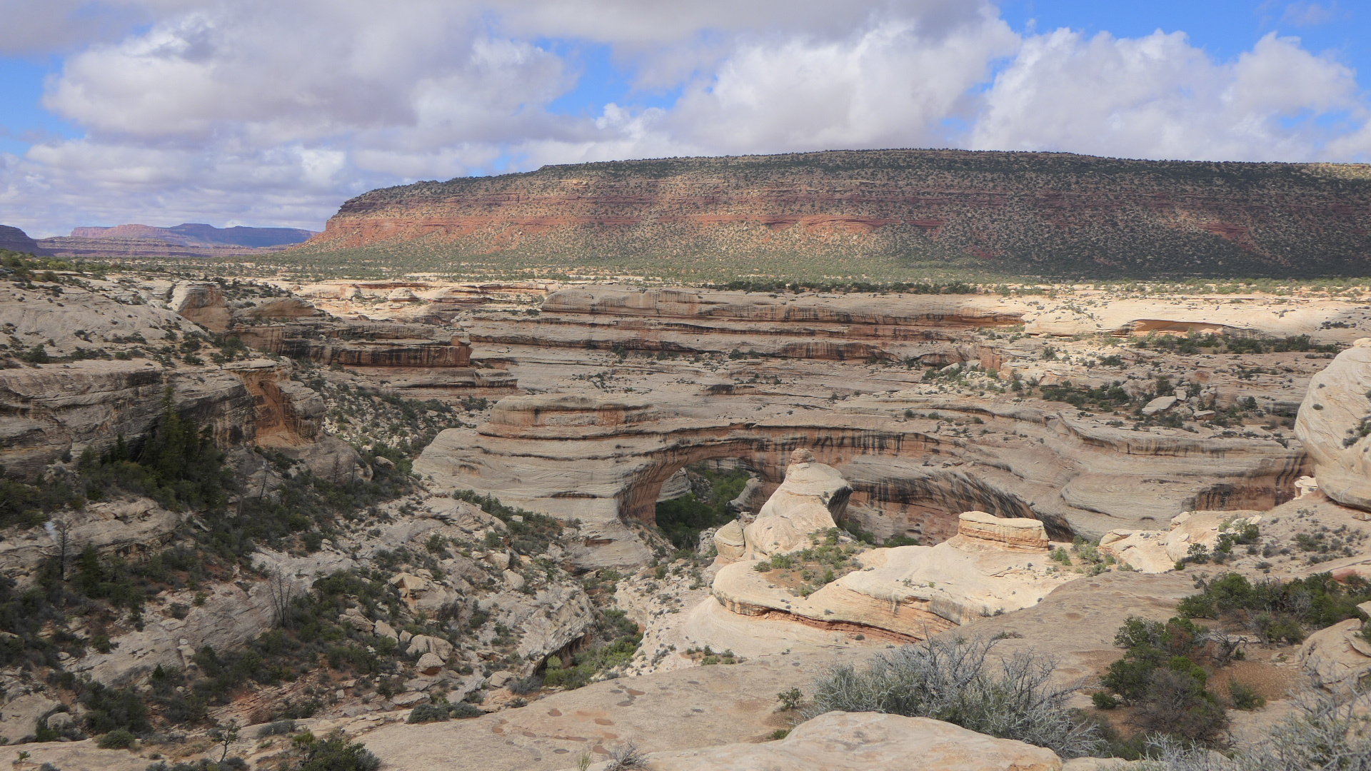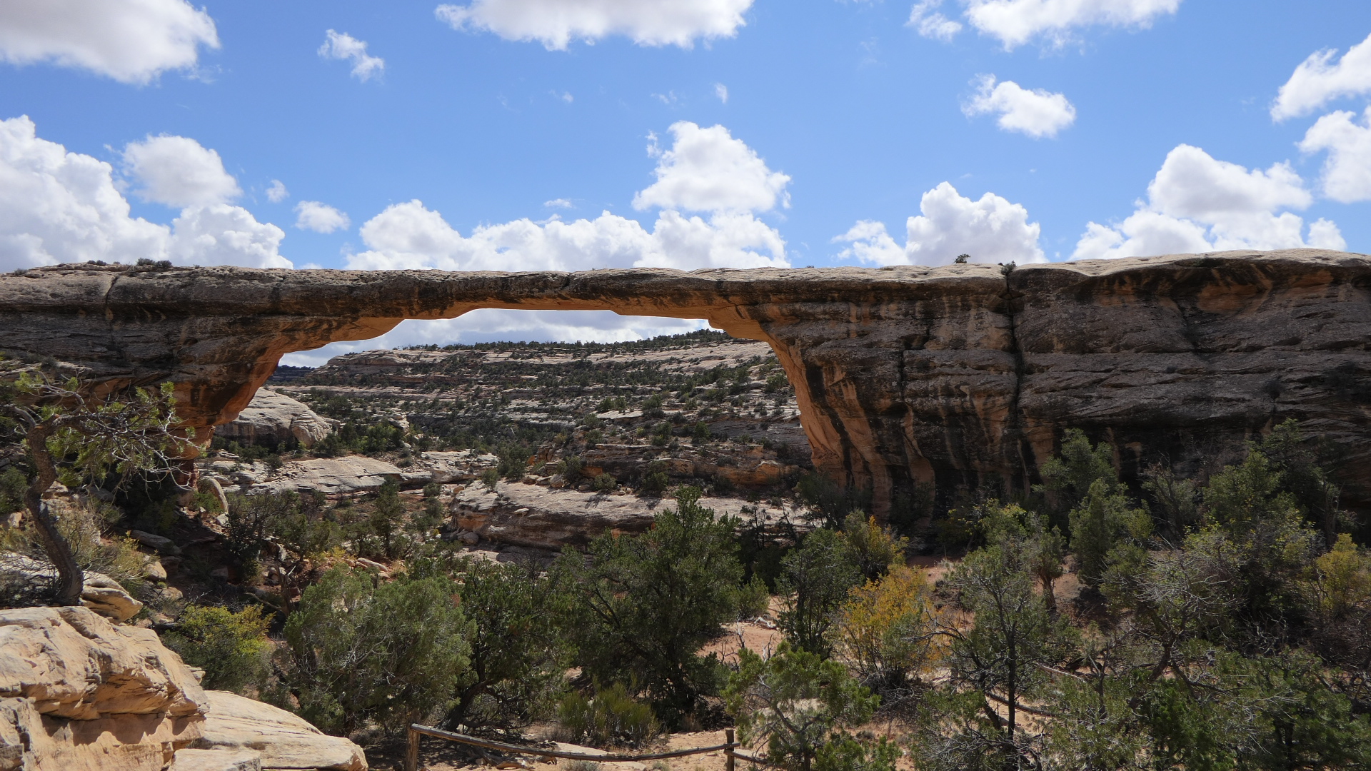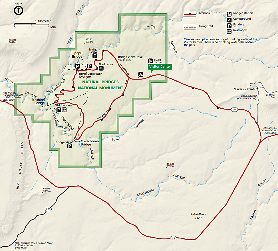 아치는 주로 얼고 녹는 과정이 반복되며 일어나는 풍화작용에 의해 형성되고 브리지는 흐르는 물에 의한 침식작용에 의해서 만들어진다. 따라서 브리지는 물이 흐르던 협곡에 주로 있고 아치는 불쑥 튀어나와 덩그마니 있다. Natural Bridges 일대의 지질은 흰색을 띤 Permian Sandstone으로 브리지가 있는 협곡의 이름도 White Canyon이다. 현재 White Canyon은 우기를 제외하고는 아주 적은 양의 물이 흐르고 있다. Natural Bridges National Monument는 약 9 mile 길이의 일방통행인 Bridge View Drive로 한바퀴 돌 수 있다. 이 곳에는 3개의 브리지가 있으며 각 브리지 앞에 주차장이 따로 있고 전망대와 trail head가 있다. 참고로 이런 자연 지형지물의 높이, 길이, 폭 등 크기에 관한 측정기준은 좀 애매한 편이다. 그래서 미국 국립공원과 Natural Arch and Bridge Society에서 발표한 숫자에 약간씩의 차이가 있으며 그에 따라 순위에도 차이가 있다. 이 글에서는 Natural Arch and Bridge Society가 발표한 순위만 소개한다.