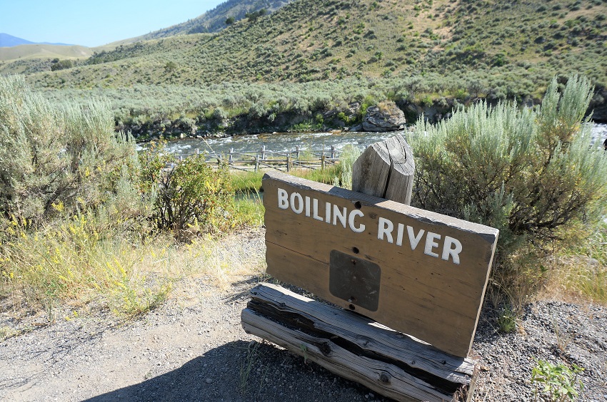 북위 45도 표지는 여러 곳에 있지만 국립공원으로 가는 길목에 있는 이 곳이 가장 유명하다고 한다. 실제 위치는 이 곳보다 0.2 mile 남쪽인데 주차공간을 내기가 적합하지 않아 여기에 표지를 세웠다 한다. 북위 45도 표지에서 조금 남쪽으로 가면 바로 Boiling River 주차장으로 가는 비포장 도로가 왼쪽으로 나는데 따로 표시가 없다. 이 곳은 온천수가 Gardiner 강으로 흘러 들어가는 지점으로 수온이 적당하여 Yellowstone 국립공원 안에서 유일하게 온천욕이 가능한 곳이다. 그러나 눈이 녹아 강물이 불고 유속이 빨라지는 늦봄부터 한여름까지 입욕이 금지된다. 우리가 갔을 때는 주차장으로 가는 길이 아예 닫혀 있었다.