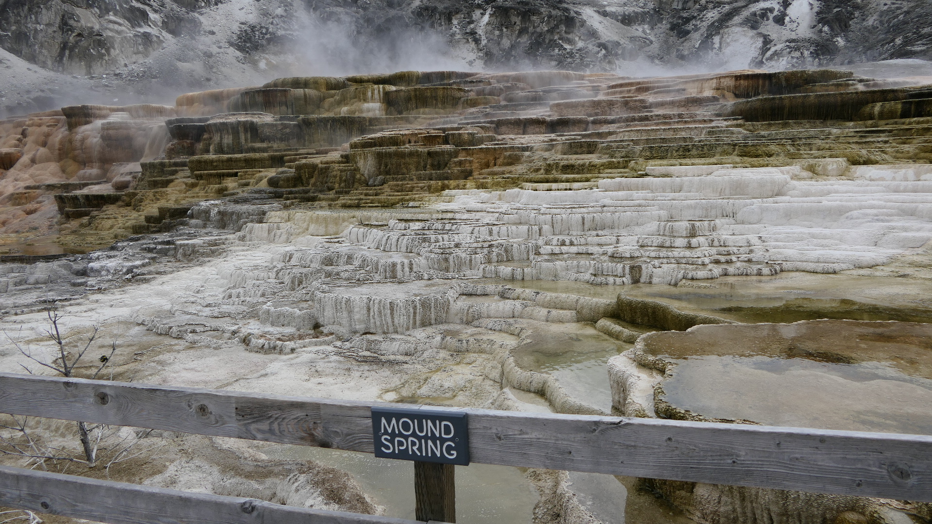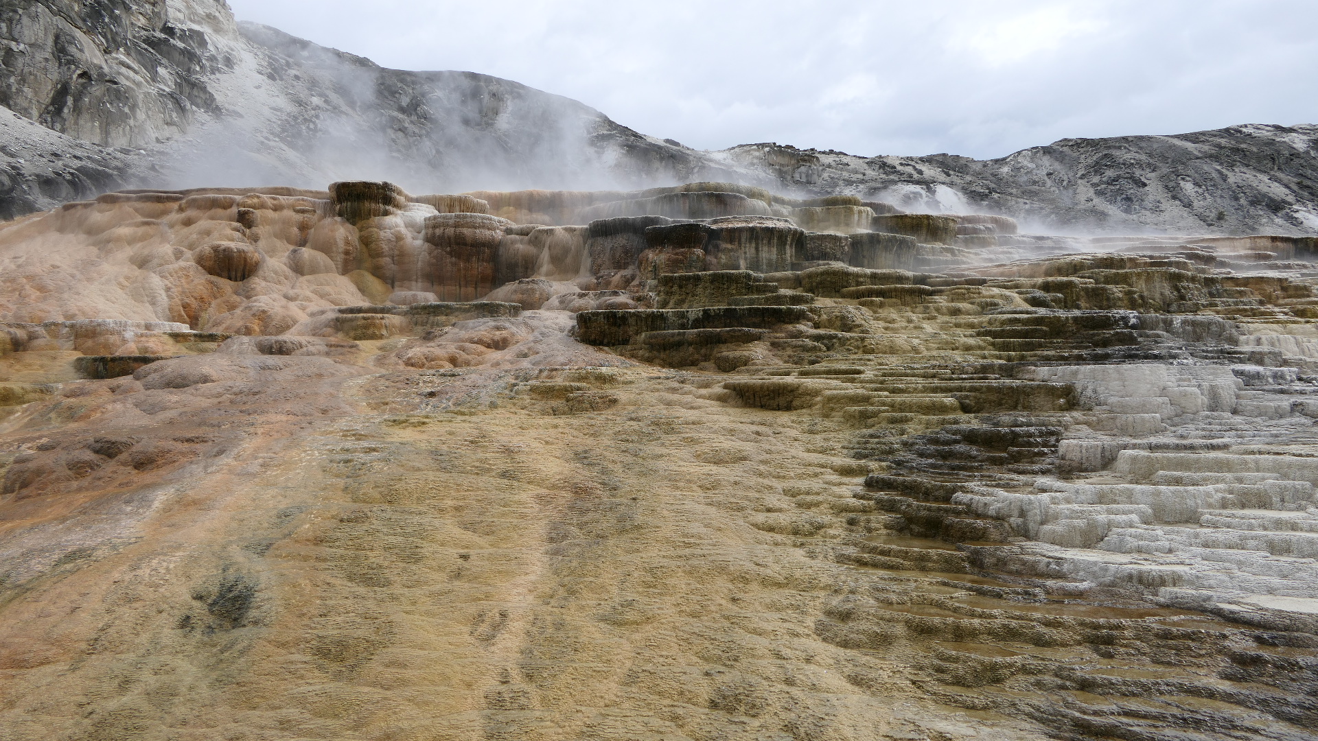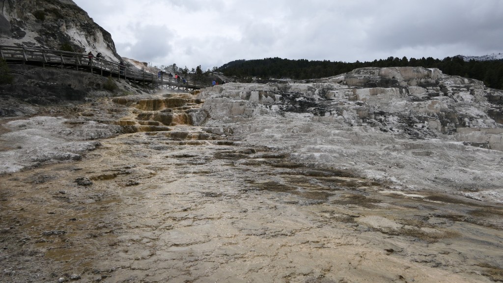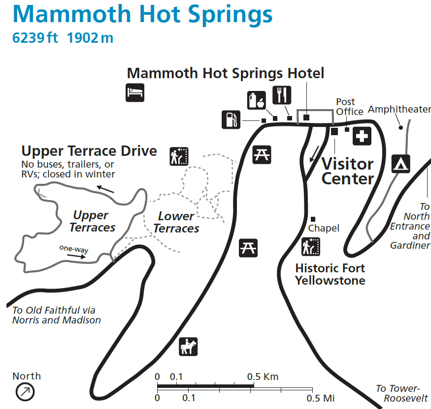 이 지역은 Travertine(온천수의 침전물)로 이루어진 테라스로 유명하다. 이곳은 종유석 동굴을 뒤집어서 안쪽이 바깥으로 나온 것이라고 이해하면 쉽다. 이 지역에는 오랜 세월 동안 이산화탄소가 많은 약산성의 온천수가 지상으로 흘러나왔다. 그 과정에 바위층의 석회석을 녹였고 이산화탄소가 증발하며 석회석을 비롯한 침전물들이 남아서 쌓이게 되었다. 되풀이된 이런 과정 끝에 지금의 Mammoth Hot Springs라고 이름한 테라스가 형성되었고 이 과정은 지금도 진행 중이다. 테라스는 위아래로 나뉘어 있는데 Lower Terrace는 설치되어 있는 boardwalk으로, Upper Terrace는 일방통행 차도로 군데군데 있는 주차장에 차를 대로 걸어서 볼 수 있다.