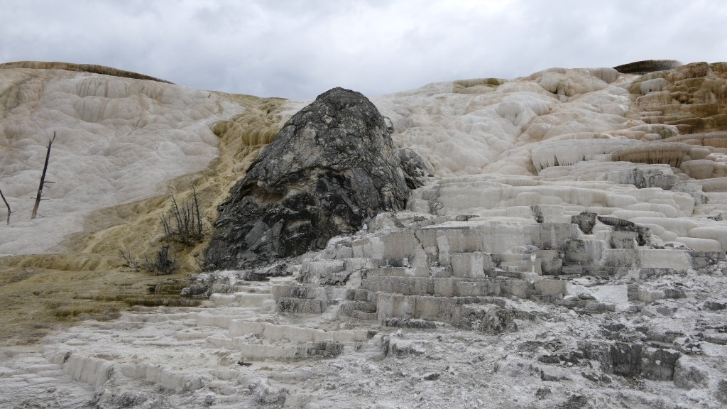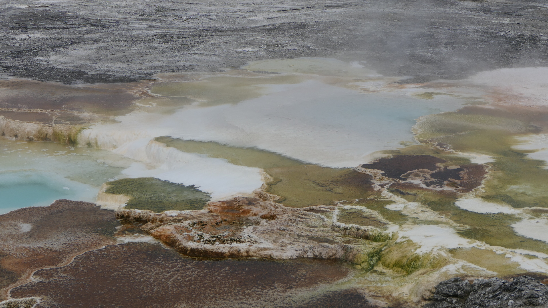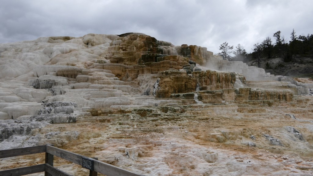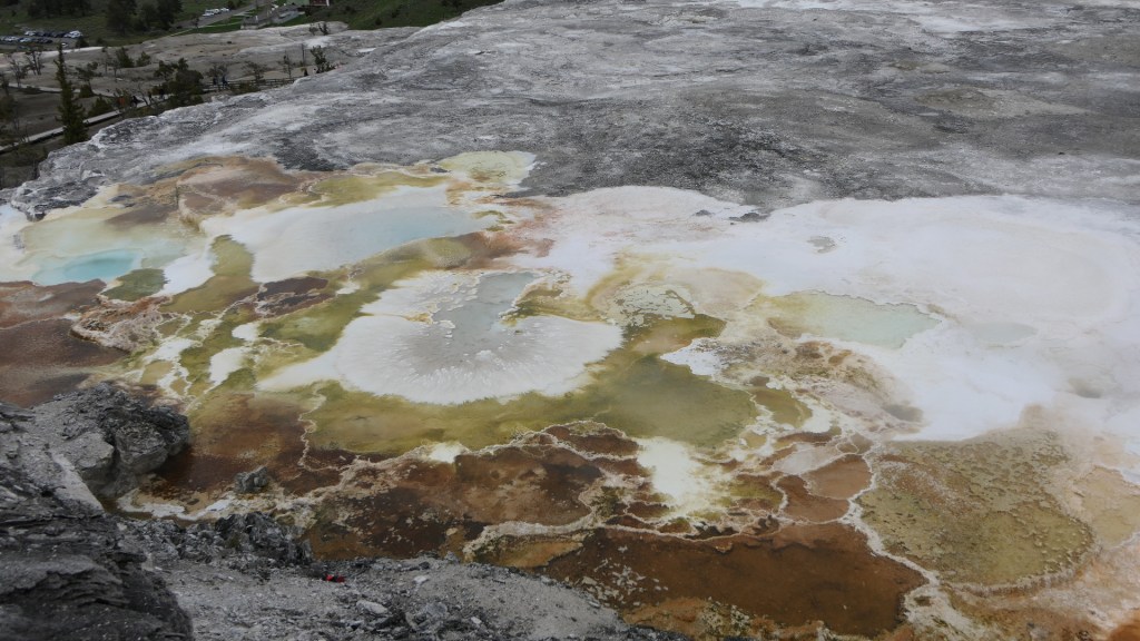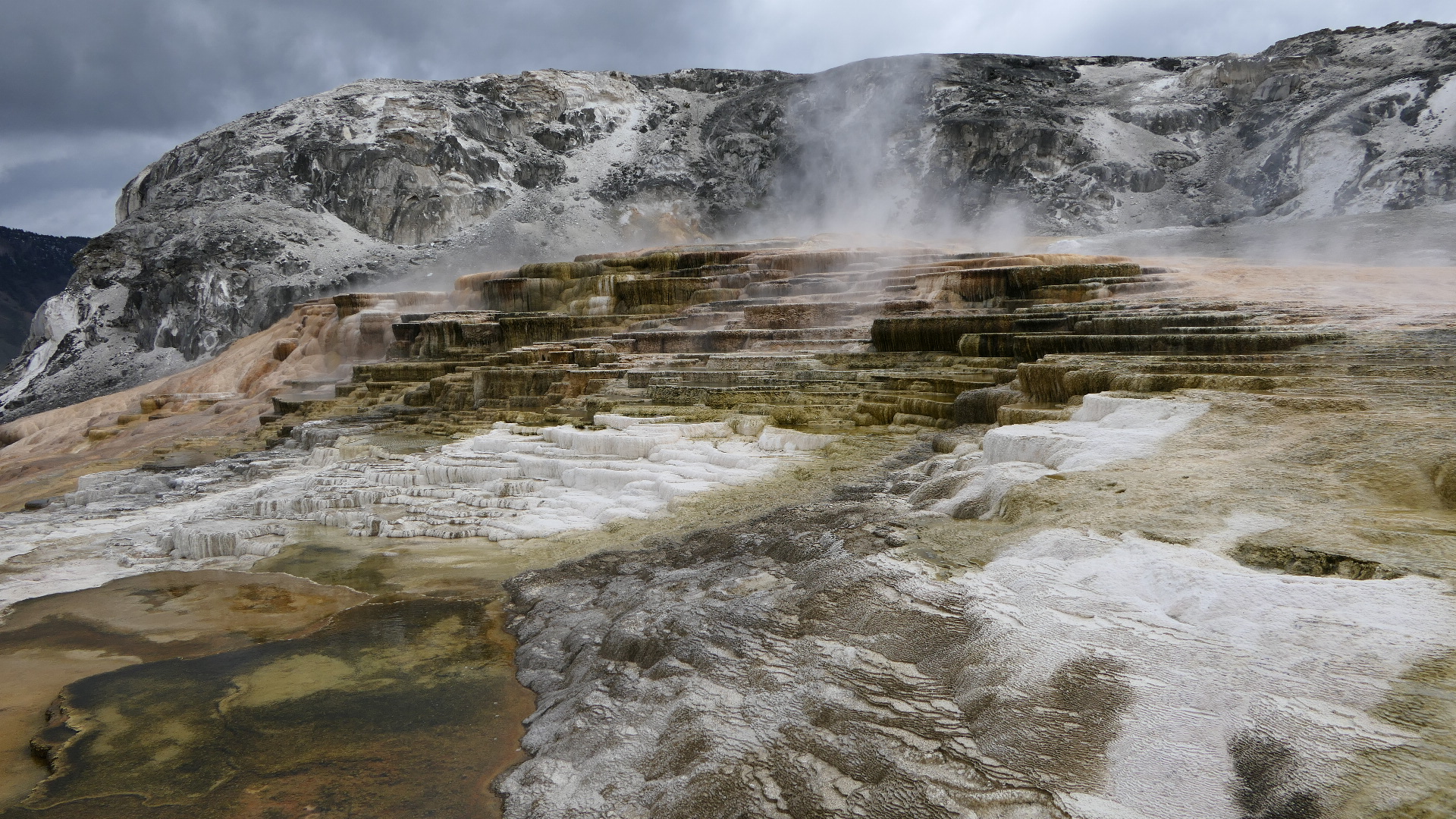 이 지역은 Travertine(온천수의 침전물)로 이루어진 테라스로 유명하다. 이곳은 종유석 동굴을 뒤집어서 안쪽이 바깥으로 나온 것이라고 이해하면 쉽다. 이 지역에는 오랜 세월 동안 이산화탄소가 많은 약산성의 온천수가 지상으로 흘러나왔다. 그 과정에 바위층의 석회석을 녹였고 이산화탄소가 증발하며 석회석을 비롯한 침전물들이 남아서 쌓이게 되었다. 되풀이된 이런 과정 끝에 지금의 Mammoth Hot Springs라고 이름한 테라스가 형성되었고 이 과정은 지금도 진행 중이다. 테라스는 위아래로 나뉘어 있는데 Lower Terrace는 설치되어 있는 boardwalk으로, Upper Terrace는 일방통행 차도로 군데군데 있는 주차장에 차를 대로 걸어서 볼 수 있다.
