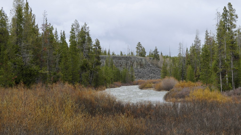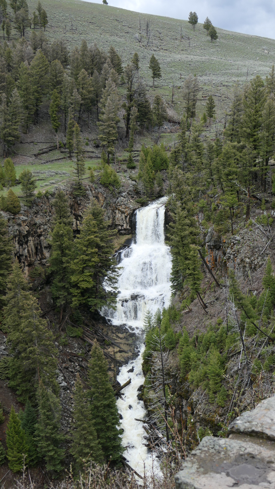 Mammoth Hot Springs에서 동쪽으로 약 4 mile 지점에 Undine Falls라는 폭포가 있는데 주차장에서 몇 걸음 가면 바로 볼 수 있다. 편도 0.4 mile trail로 가면 다른 각도에서 폭포를 볼 수가 있지만 밤새 내린 눈이 녹고 오전에 내린 진눈깨비로 길이 질퍽하여 포기.