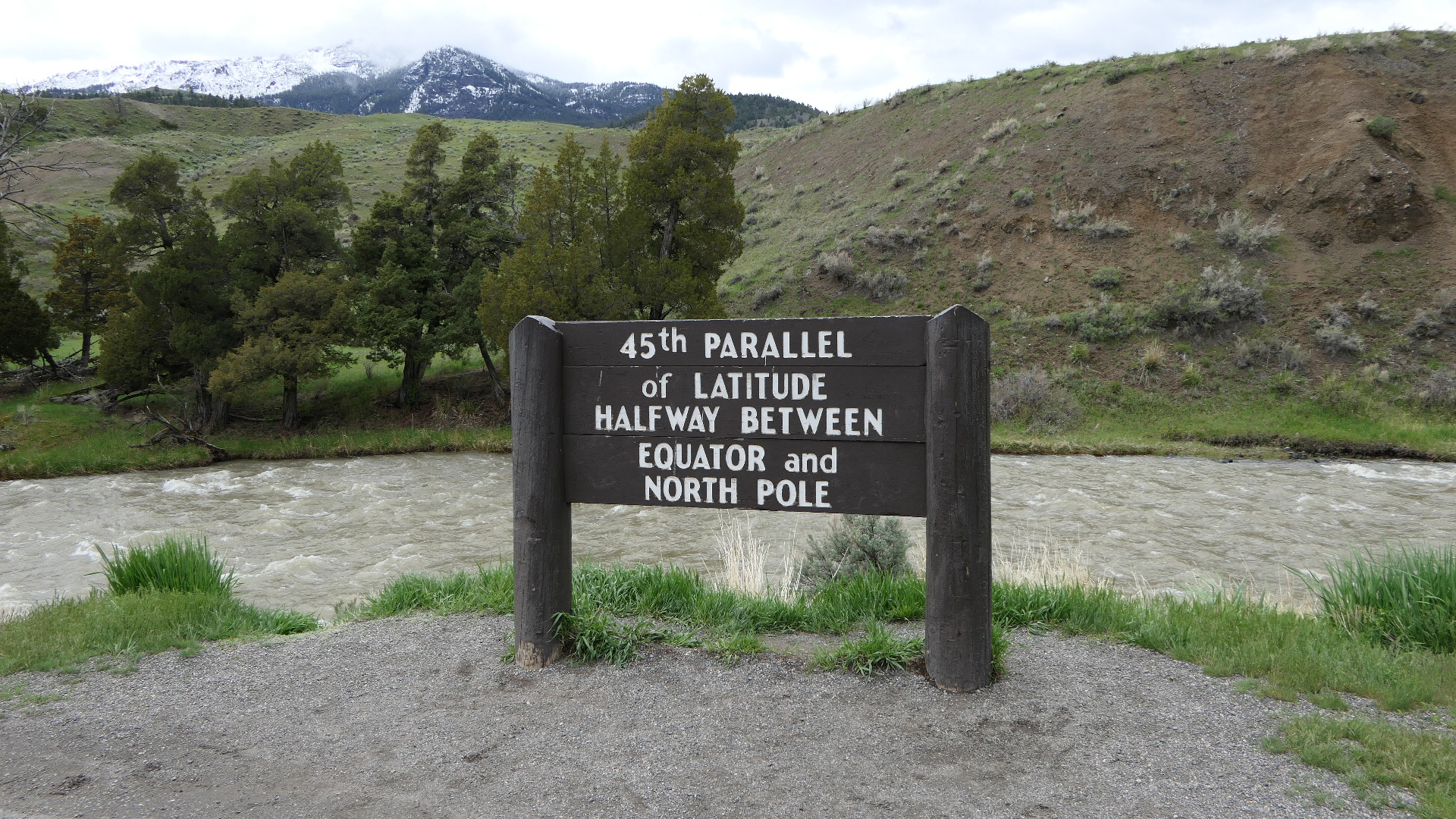 Yellowstone 국립공원 북쪽 입구를 통과하여 US-89로 가다 보면 북위 45도 표지가 나오는데 적도와 북극의 중간지점이다.