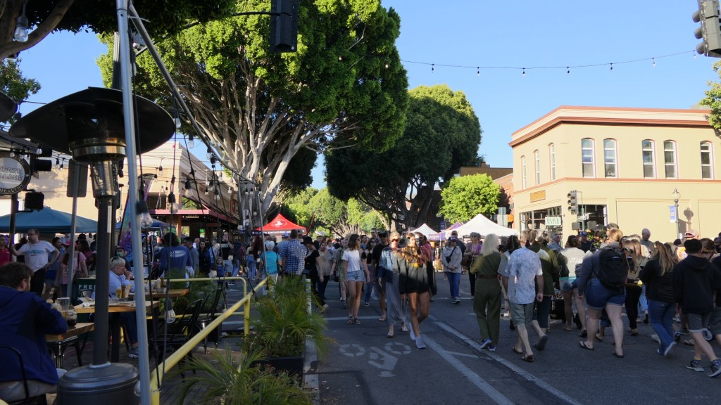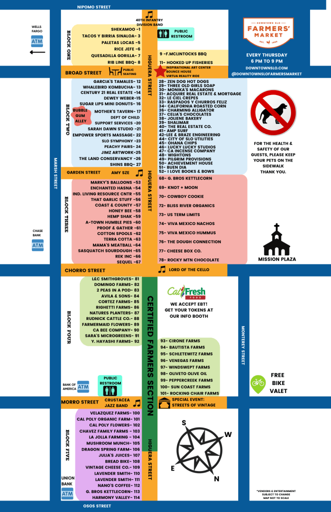 SLO하면 단연 매주 목요일 6시부터 9시까지 열리는 Farmers’ Market이다. Higuera Street을 중심으로 북쪽으로는 Osos Street, 남쪽으로는 Nipomo Street까지에 각가지 야시장이 열린다. Chorro Street을 경계로 북쪽은 청과물과 식물들, 남쪽은 기타 음식과 상품들을 파는 점포들이 자리잡고 있다. 군데군데 길거리공연도 있어 심심치가 않다. 대만을 위시한 동남아에서 열리는 야시장에 비하면 작은 규모이지만 미국에서는 제법 큰 야시장으로 SLO를 방문할 때 꼭 들려야 하는 곳으로 꼽힌다. 사실 여기 있는 주전부리 점포들이 손주들을 꼬시는데 주요했다. 저녁은 식당에서 먹고 후식은 Farmers’ Market을 이리저리 구경하며 사 먹기로 하였다. 아래에 2022년 8월18일 점포 명단을 첨부하는데 위가 남쪽임을 주의하기 바란다. 최근 정보는 이 link로