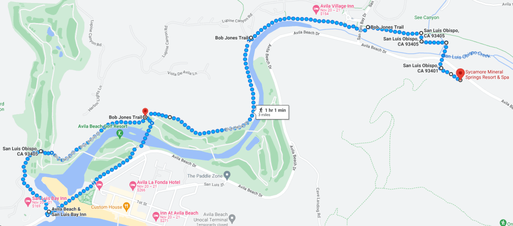 Bob Jones Trail Head는 Sycamore 온천에서 약 1 mile동쪽에 위치해 있지만 Sycamore 온천에서 연결되기 때문에 직접 출발할 수 있다. San Luis Obispo Creek, Avila Beach Golf Resort, Avila Beach 등을 끼고 있는 이 trail은 평탄하고 경관이 수려하다.