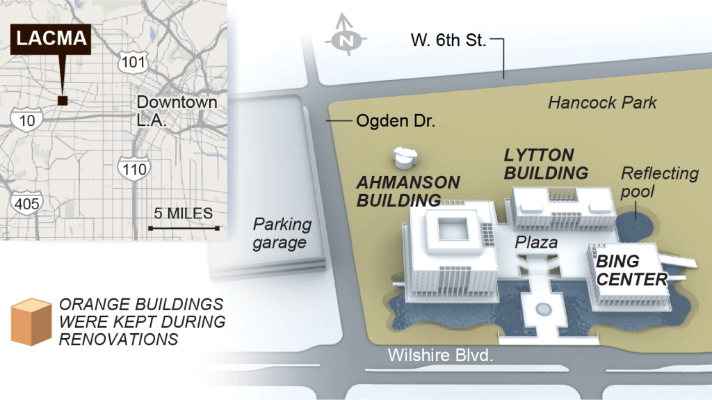 Arts of the Americas Building을 포함하여 개관 당시부터 있었던 건물 4동을 철거하고 건축설계가 Zumthor의 청사진에 의한 공사가 현재 진행 중이다. 이 공사가 끝나면 전시면적이 현재의 약 130,000 square feet에서 70% 증가된 220,000으로 확장될 것이다. 2024년 완공예정으로 이 일대가 La Brea Tar Pits and Museum, The Craft and Folk Art Museum, The Petersen Automotive Museum, The Academy Museum of Motion Pictures를 포함하여 LA’s Museum Mile로 자리매김을 하는 결정판이 될 것으로 기대되고 있다 – 위의 지도 참조.