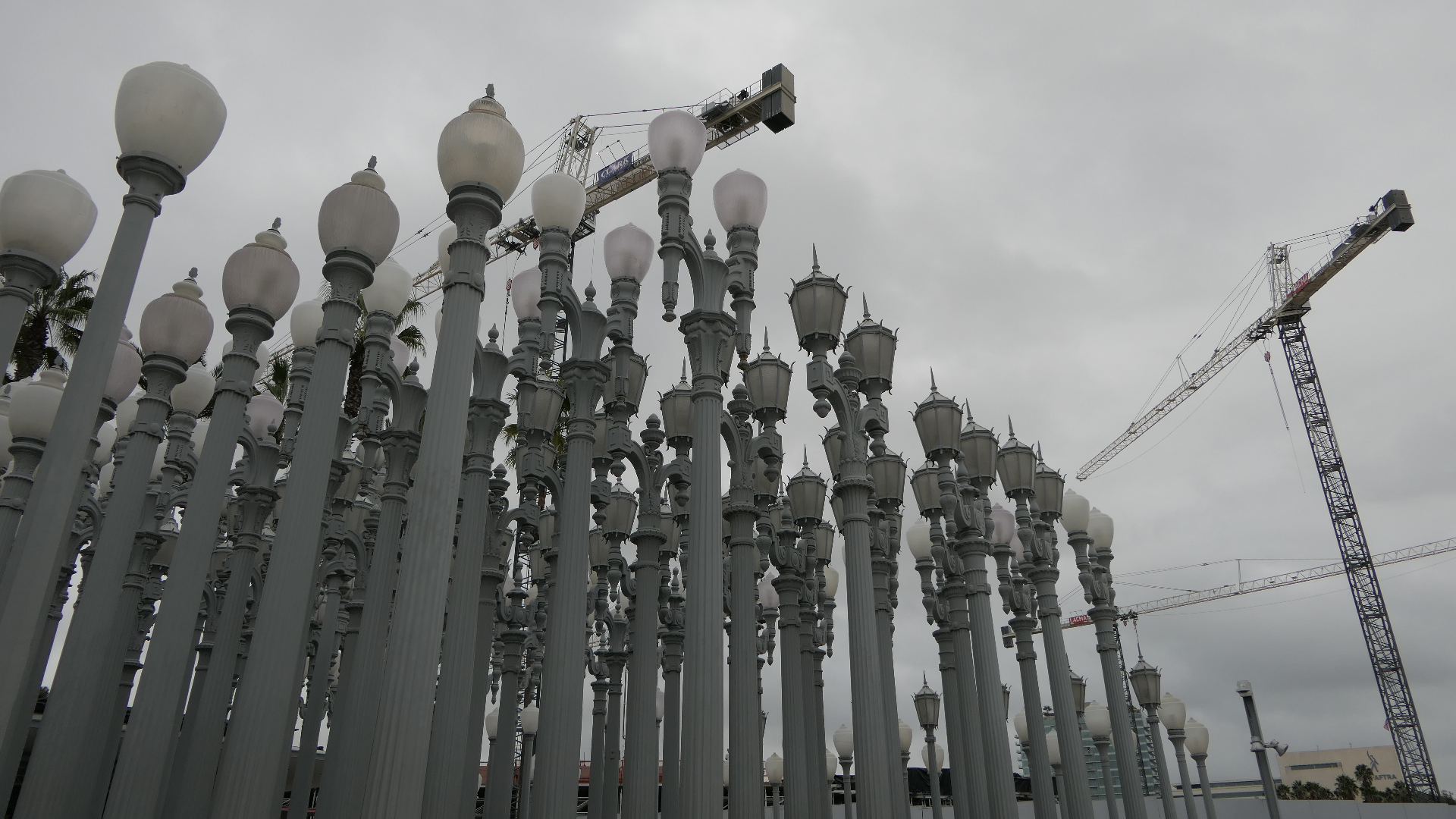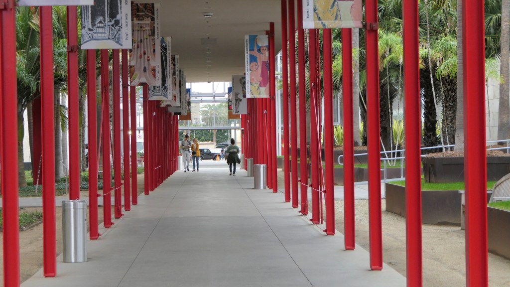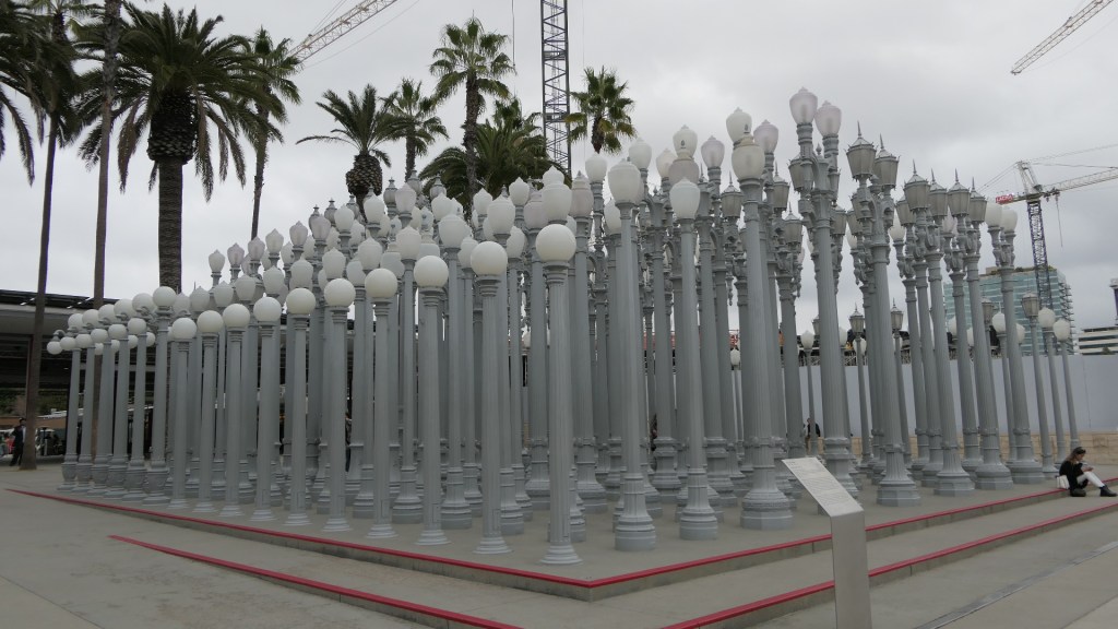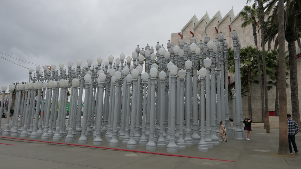 마침 한국특별전이 The Space Between: The Modern in Korean Art(한국미술의 근대 사이의 공간)라는 이름으로 2022년 9월 11일부터 2023년 2월 19일까지 기획전시 중이라 오랜만에 LACMA를 찾았다. 가는 날이 장날이라고 보슬비가 내리고 을씨년스러운 날씨라 바깥에서 찍은 사진들이 우중충하게 나왔지만 몇 장 소개한다. 우선 Wilshire Blvd 쪽에 있는 202개의 가로등으로 구성된 Chris Burden의 Urban Light을 소개한다. Chris Burden은 1920년대 Los Angeles와 인근 도시들에 실제로 있었던 주철제(cast iron) 가로등을 벼룩시장(flea market) 등지에서 수집하여 복원하고 회색으로 칠한 후에 일정간격으로 배치하는 식으로 이 작품을 완성하였다. 그는 가로등이야말로 산업화 및 문명화되고 세련된 도시의 모습과 어둠 속에서도 안전함을 상징한다고 생각했다. 지금도 태양광발전으로 저녁 때가 되면 불이 들어와 일대를 밝히고 있다.