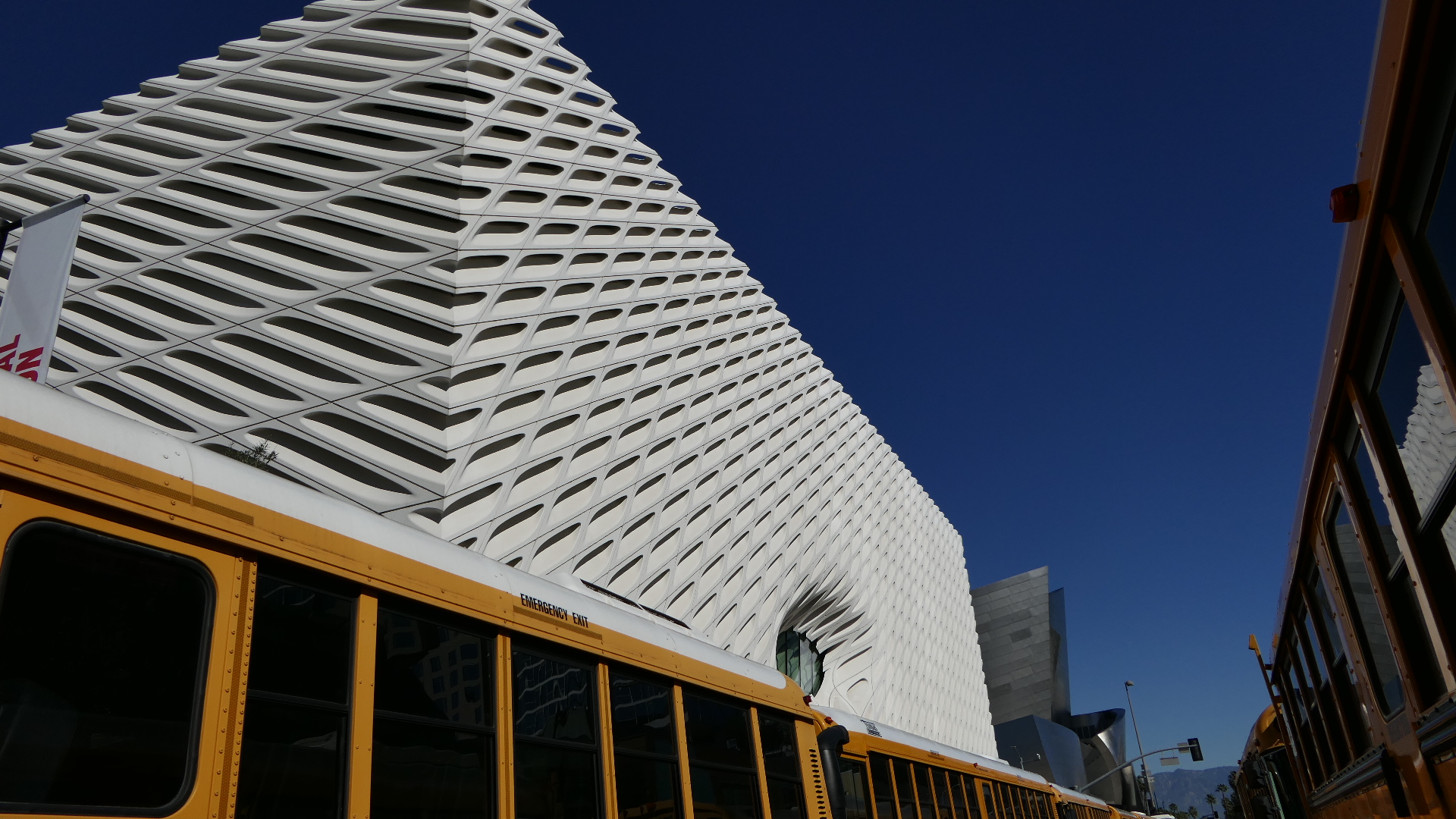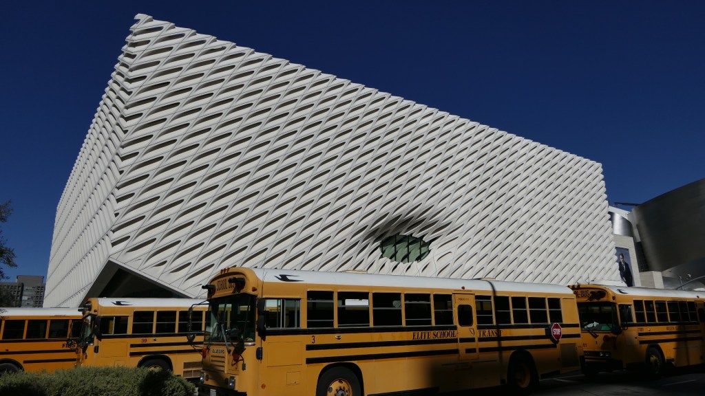 가는 날이 장날이라고, 우리가 간 날 길 건너편에 있는 Walt Disney Concert Hall에서 Symphonies for Youth 프로그램이 있어, Los Angeles 인근 학교 학생들이 단체로 field trip을 와 수많은 school bus들이 길을 막고 주차되어 있어 미술관 일대에 대혼잡을 이루고 있었다. The Broad 미술관의 외벽은 벌집같이 설계되어 많은 양의 자연광이 전시장으로 비추어지어 인공조명의 필요성을 최소화하였다.