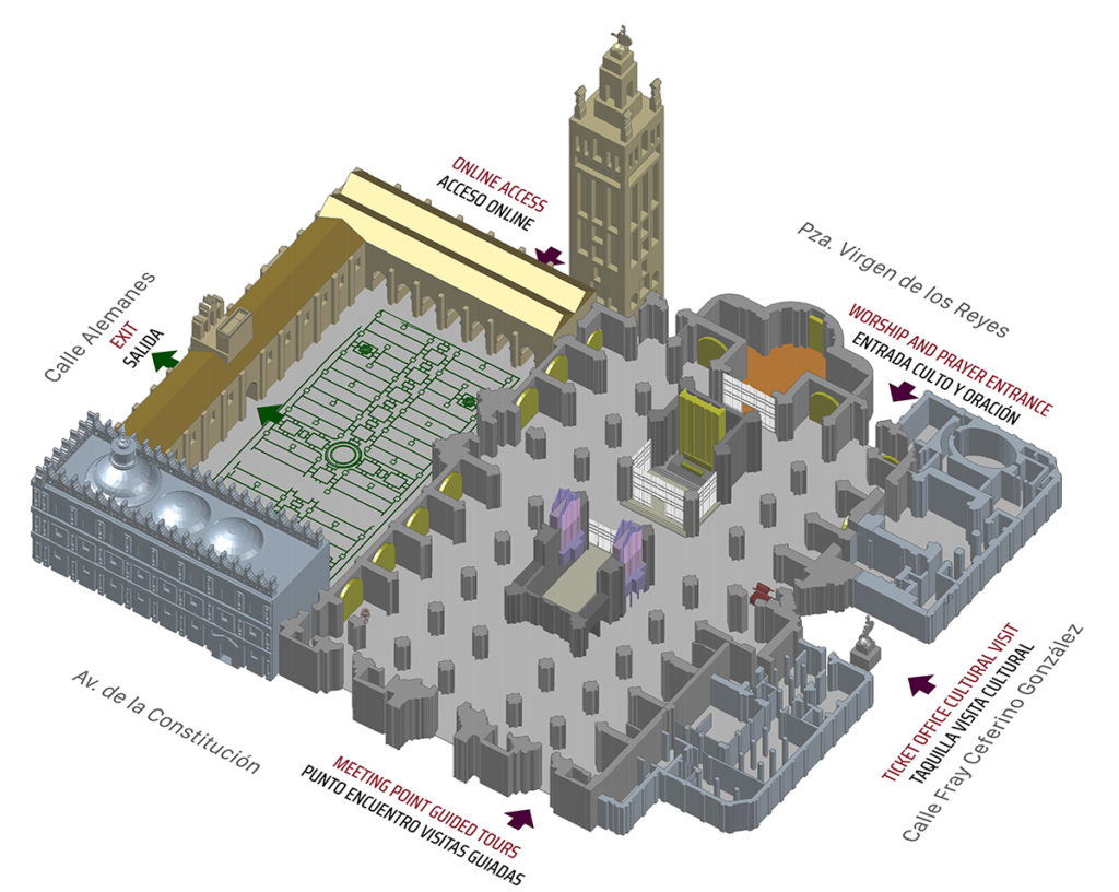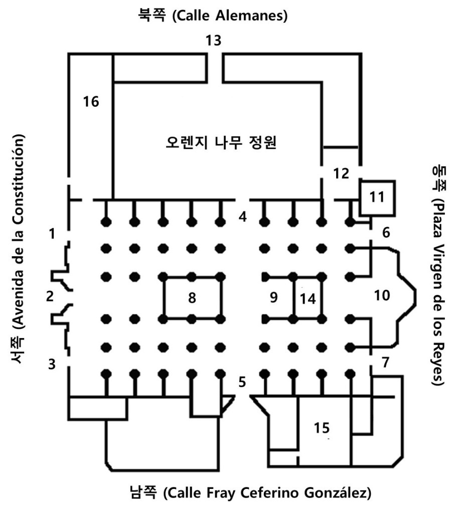 세빌성당 안내도 (Source: https://www.catedraldesevilla.es/ – source link로 가서 scroll down하면 interactive 안내도를 따라 12부분을 자세히 볼 수 있다)세빌성당 평면도 1. 침례의 문 (Door of Baptism), 2. 성모 마리아 승천의 문 (Door of Assumption), 3. 성 미카엘의 문 (Door of Saint Michael), 4. 동정녀 마리아 수태의 문 (Door of Conception), 5. 성 크리스토퍼의 문 (Door of Saint Christoper), 6. 막대기의 문 (Door of Sticks), 7. 종들의 문 (Door of Bells), 8. 성가대 (Choir), 9. 주 예배실과 제단 (Main Chapel and Main Altar), 10. 왕족 예배실 (Royal Chapel), 11. 종탑 (Bell Tower), 12. 도마뱀의 문 (Door of Lizard), 13. 용서의 문 (Door of Forgiveness), 14. 주 예배실 성물 보관실 (Sacristy of the Main Altar), 15. 주 성물 보관실 (Main Sacristy), 16. 성막 교회 (Church of Tabernacle)
