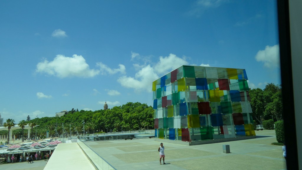 말라가 도심 Centro는 Guadalmedina 강 동쪽과 말라가 항구 북쪽에 위치해 있다. 항구로 들어가는 길목에 특이한 건물이 있어서 움직이는 버스에서 사진을 찍었는데 창문에 tinting으로 색도 이상하게 나왔다. 이 건물의 이름은 Centre Pompidou Málaga이며 말라가의 문화예술센터이다. 원래 불란서 대통령 드골이 파리에 문화예술센터 건립계획을 발표했는데 그 다음 대통령 폼피두 때 완공되고 개관하며 그의 이름이 붙여졌다. 그런데 이 문화예술센터가 많은 시민들의 호응을 받게 되자 불란서 내와 세계 여러 곳에 지점이 지어졌다. 그 중 하나가 말라가에 있는 것이다. 단체관광이기에 달리는 버스에서 건물만 보고 지나가서 많이 아쉽다.