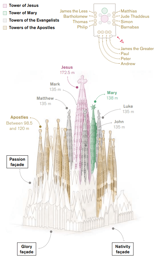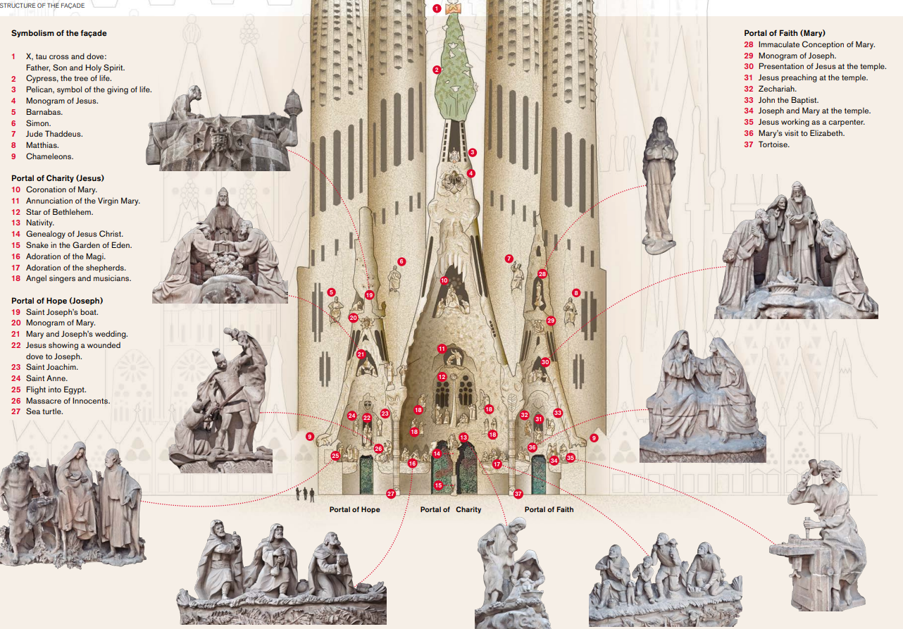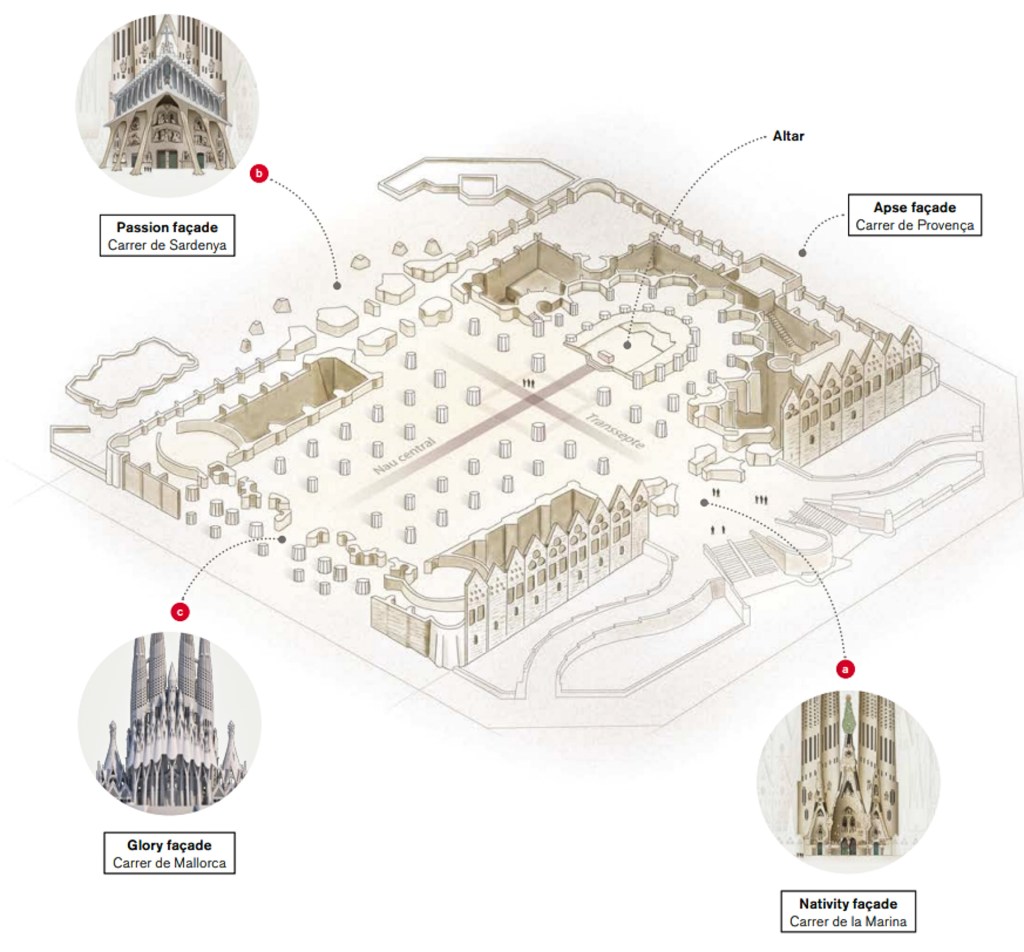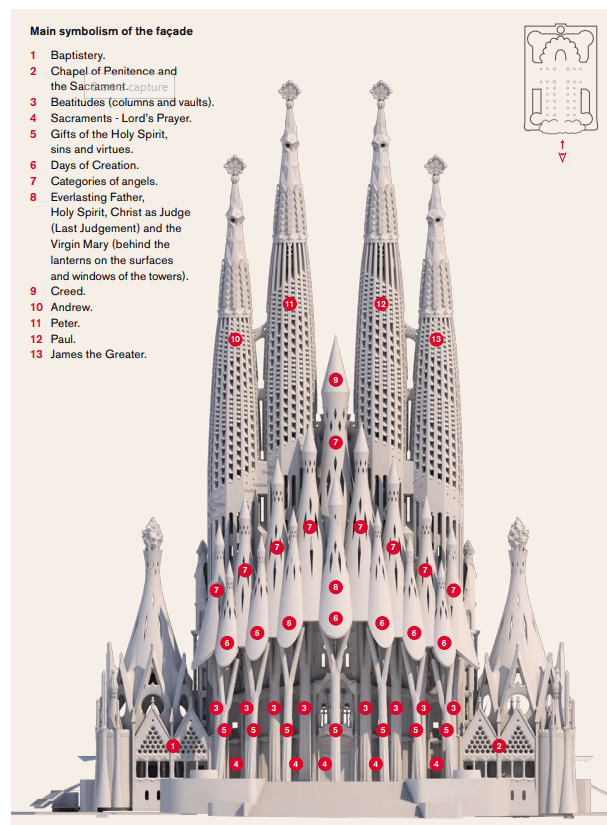 사그라다 파밀리아는 기본적으로 장방형이며 모서리가 남북을 향하고 있다. 각 4면에는 특정한 주제가 있는데 Apse를 제외하고는 성경에 근거한 조각품들로 장식되어 있다. 현재 관광객을 위한 입구가 있는 Carrer de la Marina 길가인 북동쪽은 예수님의 탄생(Nativity)이 주제인데 뜨는 해에 그 상징성을 맞추고 있다. Carrer de Provença 길가인 북서쪽은 Apse 즉 중앙제단의 바깥쪽에 해당된다. Carrer de Sardenya 길가인 남서쪽은 예수님의 수난(Passion)이 주제인데 석양을 상징적으로 택했다. Carrer de Mallorca 길가인 남동쪽은 예수님의 영광(Glory)에 초점이 맞추어져 있다. 가우디는 18개의 첨탑을 설계했는데 각각 예수님, 성모 마리아, 12 사도 및 4 복음서저자를 상징한다.