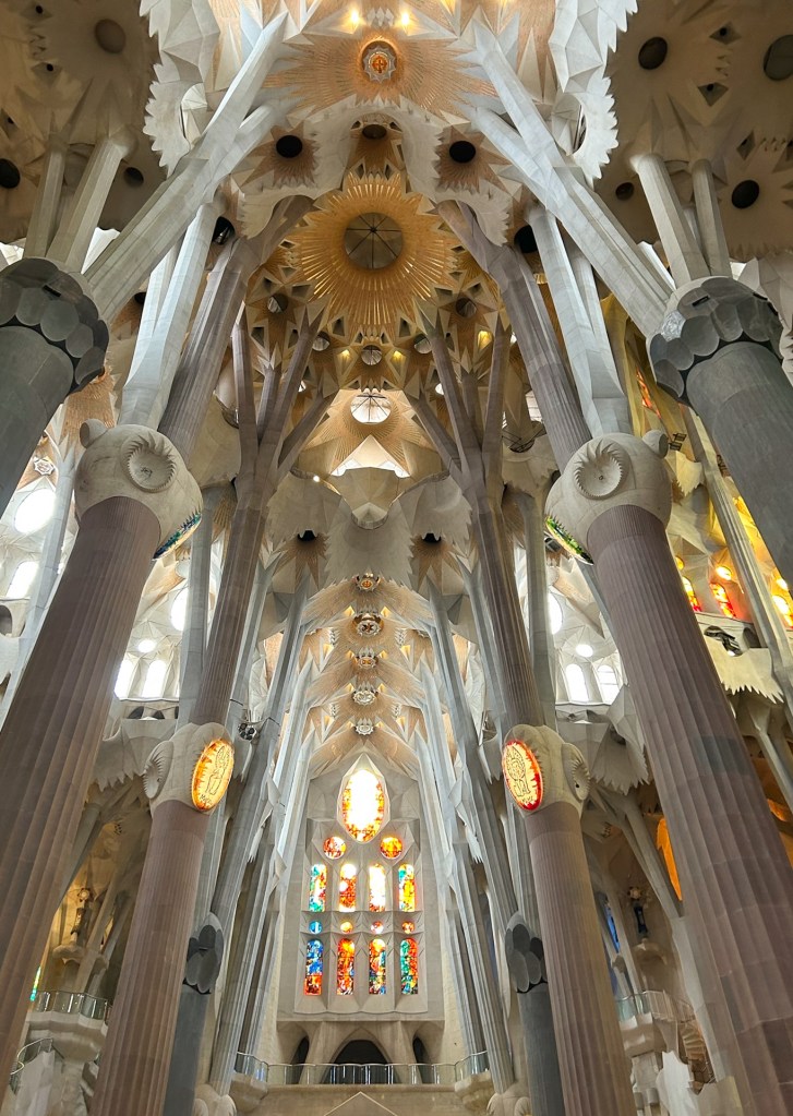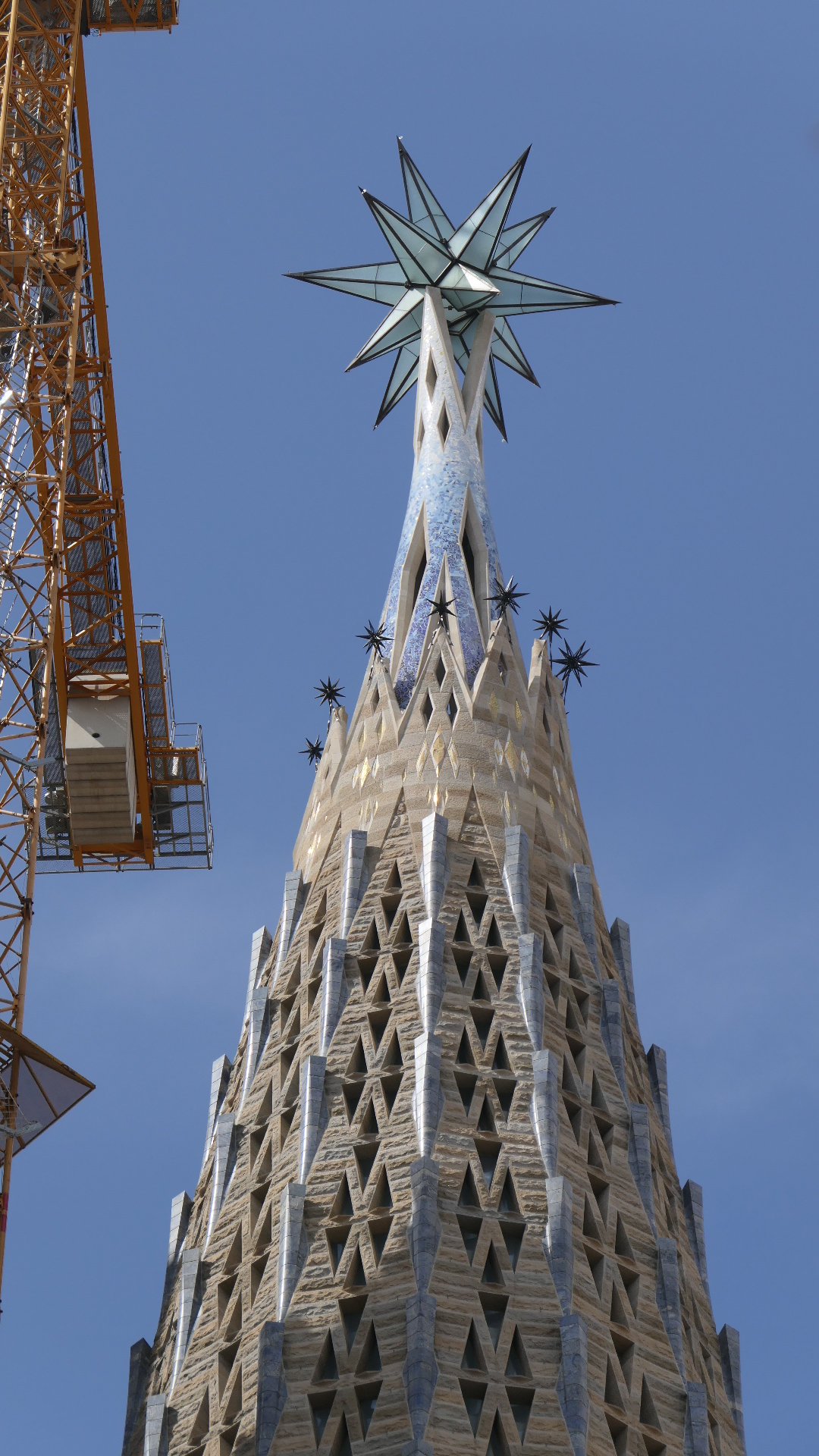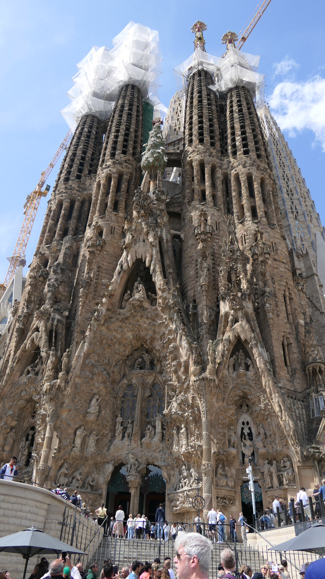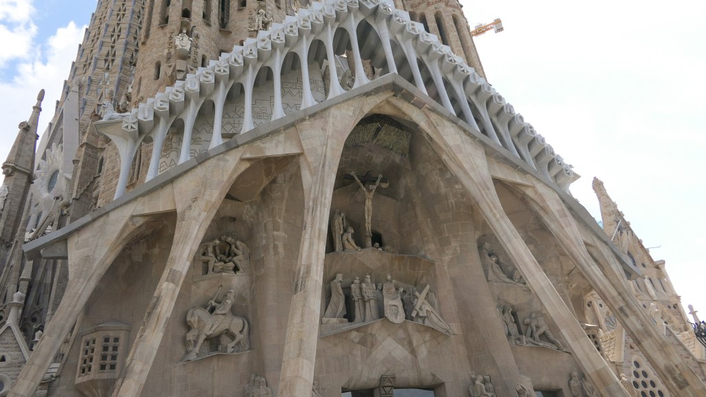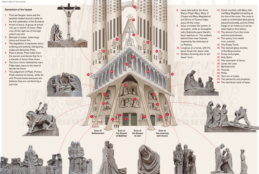 사그라다 파밀리아 Nativity Façade사그라다 파밀리아 Nativity Façade사그라다 파밀리아 Nativity Façade – 조각품 설명 (Source: https://sagradafamilia.org/en/home)사그라다 파밀리아 Nativity Façade – Coronation of Mary사그라다 파밀리아 Nativity Façade933 사그라다 파밀리아 Nativity Façade933 사그라다 파밀리아 Nativity Façade사그라다 파밀리아 성모 마리아 첨탑 – 2021년에 완공되었다사그라다 파밀리아 Passion Façade사그라다 파밀리아 Passion Façade – 6개의 기울어진 기둥은 잡아당겨 상한 근육을 상징하였고 18개의 뼈 모양의 작은 기둥들의 정점에는 십자가가 있다. 벽면을 장식한 조각들은 예수님의 마지막 하루를 최후의 만찬부터 십자가에 달리시기까지를 담고 있다. Passion Façade의 거의 모든 조각품들은 스페인 출신 조각가 Josep Maria Subirachs의 작품이다.사그라다 파밀리아 Passion Façade – 조각품 설명 (Source: https://sagradafamilia.org/en/home)사그라다 파밀리아 Passion Façade – 구레네 사람 시몬이 예수님의 십자가를 대신 지고 갈 때 슬피 울며 따라오는 여인들을 위로하시는 주님사그라다 파밀리아 Passion Façade – 십자가에 달리신 예수님과 곁에 있었던 마리아, 막달라 마리아, 사랑하는 제자 요한사그라다 파밀리아 Glory Façade – 최후의 심판 때 부활 승천하신 주님을 통하여 구원에 이르는 교리가 담겨 있다. 사그라다 파밀리아의 가장 크고 감동을 줄 외관으로 현재 공사가 진행 중이다. 성당 내부에 있는 5개의 nave(본당 통로)로 통하는 7개의 문이 있는데 3개는 중앙, 좌우로 각각 2개씩이다. 이 7개의 문은 7가지의 성례를 뜻한다: 세례, 입교, 성찬, 참회, 거룩한 명령 (교단에 따라 정의가 다를 수 있다), 결혼, 병자 성사.사그라다 파밀리아 Glory Façade – 설계도에 의한 설명 (Source: https://sagradafamilia.org/en/home)사그라다 파밀리아 Glory Façade 한 첨탑 위의 장식사그라다 파밀리아 내부사그라다 파밀리아 내부 – 중앙통로 천장사그라다 파밀리아 내부 – 중앙통로 교차점에 모자이크 된 Holy Family 예수, 마리아, 요셉을 뜻하는JMJ사그라다 파밀리아 내부 – Nativity Tower로 올라가는 쪽사그라다 파밀리아 내부사그라다 파밀리아 내부 – 색유리 창 중 상단 2줄의 원형은 성당을 의미하고 그 아래 3단의 사람 모양은 성자들을 상징한다.사그라다 파밀리아 내부 – Glory Façade 에서 들어오는 7개의 문 중 성찬예식의 문 안쪽에 50개 언어로 새겨진 주기도문의 한 구절 ‘우리에게 일용할 양식을 주시옵고’, 밑에서 5째 줄 가운데 색이 벗겨진 A|G는 가우디의 이름 첫 자이며 문 손잡이이다.사그라다 파밀리아 박물관에 전시되어 있는 처음 책임자 Francisco de Paula del Villar의 설계도 – 건축에 종사했던 사림들의 아이들을 위하여 지었던 학교 건물을 박물관으로 개조하였다.사그라다 파밀리아 Nativity Tower 꼭대기에서 본 다른 탑의 일부와 가우디 공원의 연못 – Nativity Tower와 Passion Tower가 있는데 성당 내부 관광시간과 인원에 연계되어 배정된다. 올라갈 때는 승강기를 타지만 내려올 때는 나선형 계단으로 걸어서 내려와야 한다.사그라다 파밀리아 Nativity Tower에서 본 다른 탑의 공사 현장사그라다 파밀리아 Nativity Tower에서 내려오는 나선형의 계단Avenida de Gaudi에서 본 사그라다 파밀리아