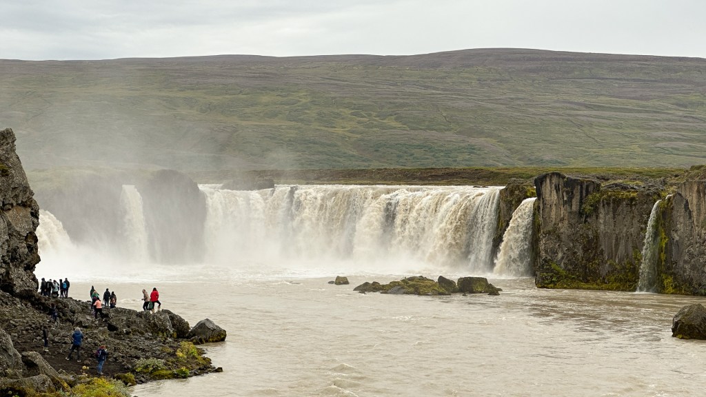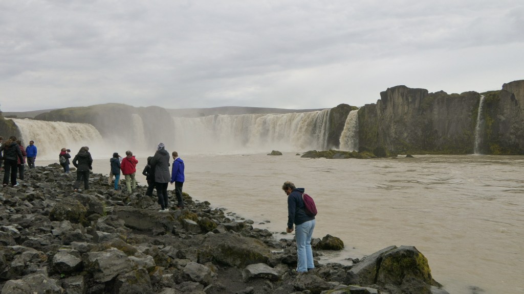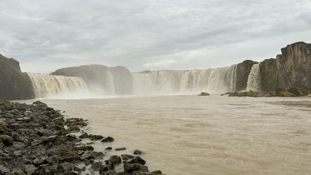 Goðafoss(고다포스, Waterfall of God)는 Skjálfandafljót(스케얄판다피요트, Trembling Rapids) 강줄기에 있는 폭 98 feet(30 m)의 말발굽 모양의 폭포이다. 폭포를 향하여 보았을 때 왼쪽이 조금 낮아 높이 30 feet(9 m)이고 오른쪽이 55 feet(17 m)이다. 이 폭포의 이름에 대한 해석은 ‘Goð’를 우상으로, 또는 ‘Goði’로 보아 우두머리라는 해석도 있다. 10세기 말에 기독교를 국교로 선포하고 lög(sögu)maður(lawspeaker, 당시 아이슬란드 의회지도자)가 우상을 이 폭포에다 던져버렸다는 전설도 있고 하여 지금은 그냥 ‘신의 폭포’라는 별명으로 부르고 있다.