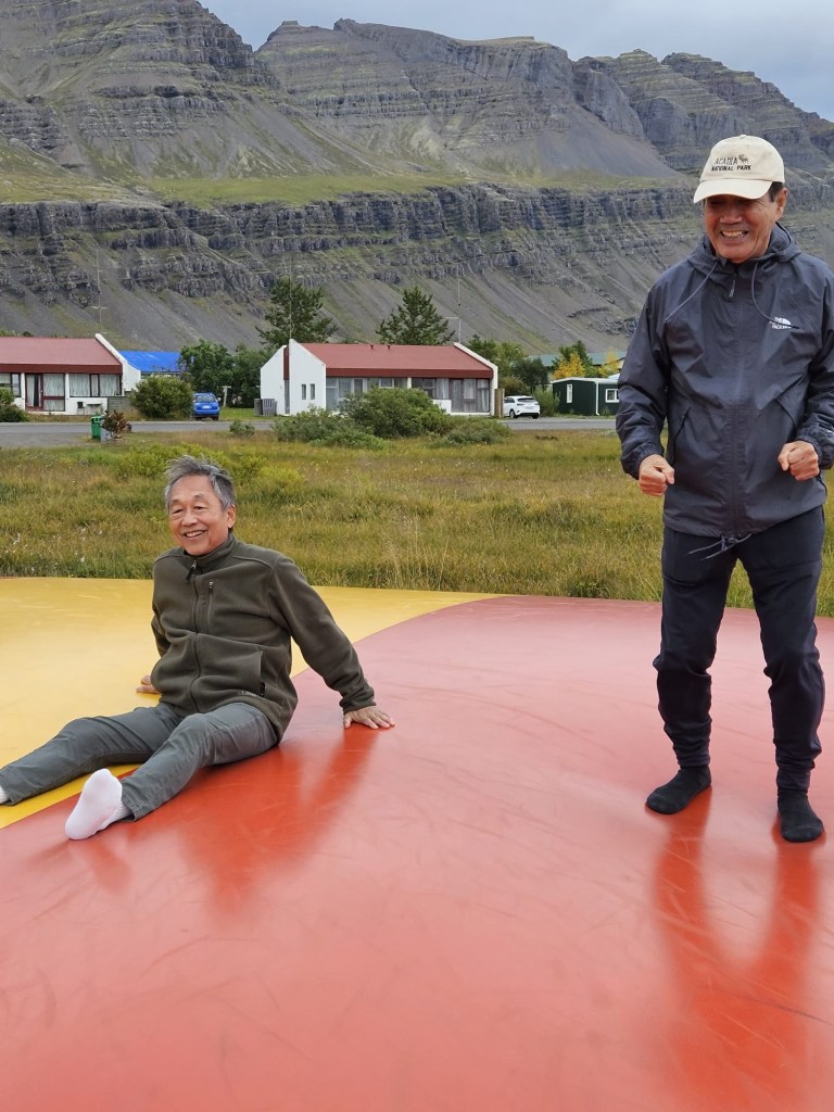 아이슬란드 마을에서 공통적으로 볼 수 있는 것이 있는데 수영장과 트램펄린(trampoline)이다. 특히 트램펄린은 사계절 사용할 수 있는 특수 고무재질로 만들어졌으며 반원통형과 비슷한데 사면에 경사가 있다. 무지개색으로 되어 있어 마을을 지나다 보면 금방 눈에 띈다. 우리도 한번 해보기로 했는데 우선 신발을 벗어야 하고 경사면에서 뛰면 영락없이 미끄러지고 만다.