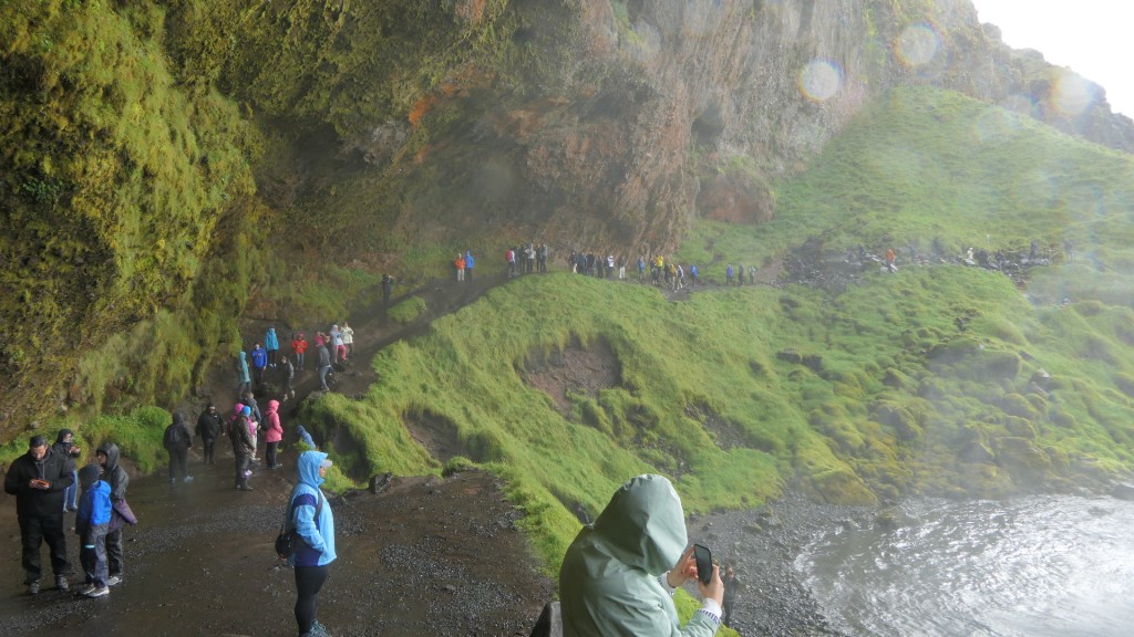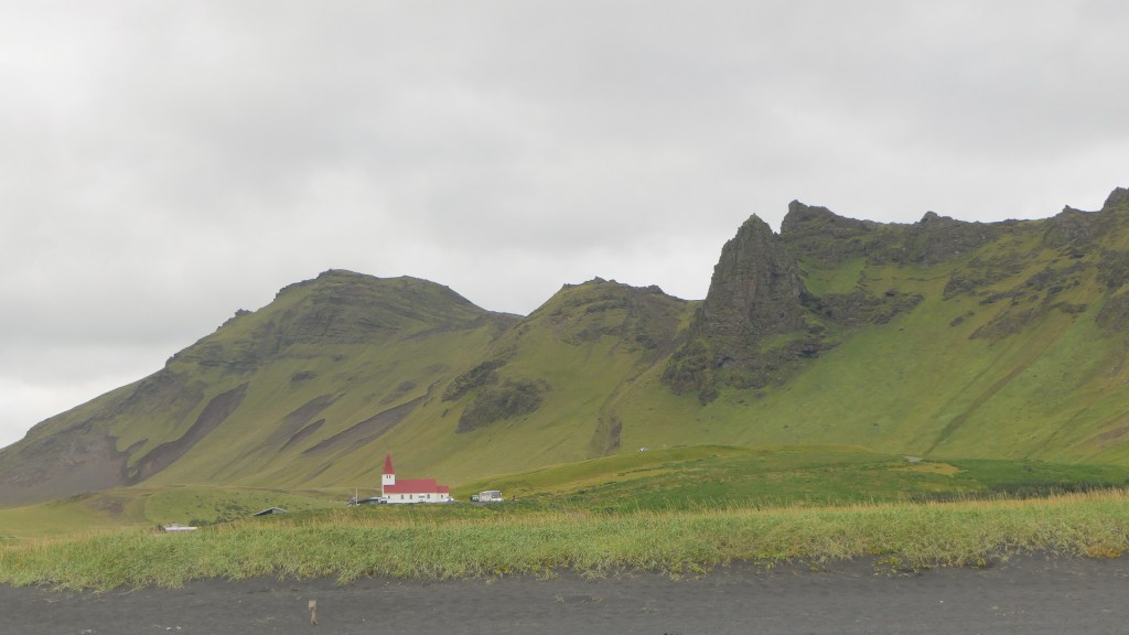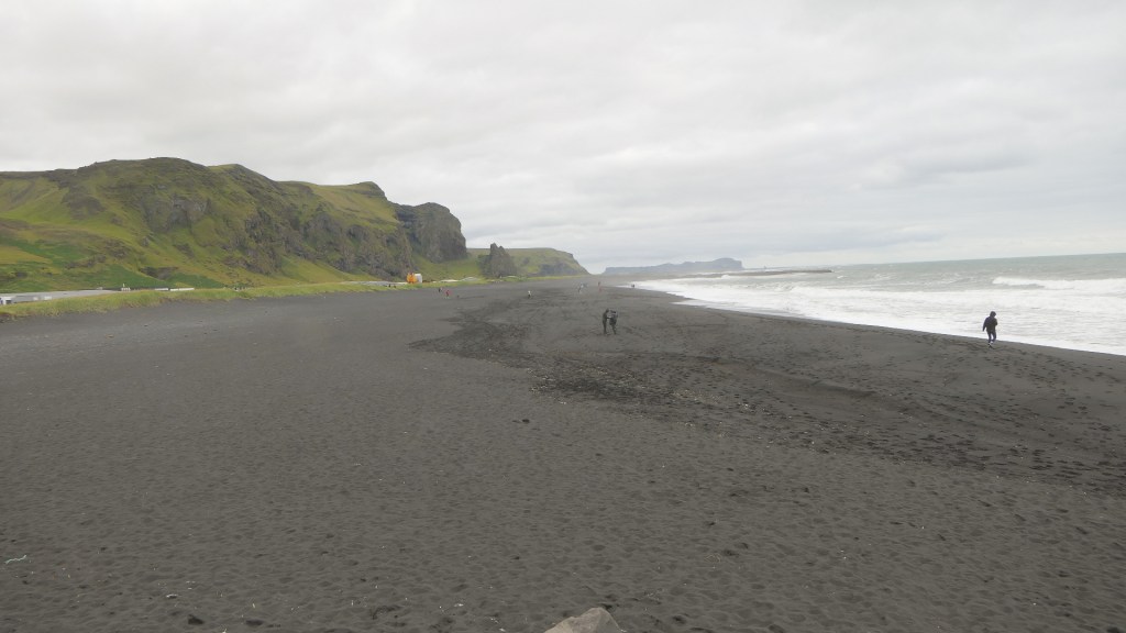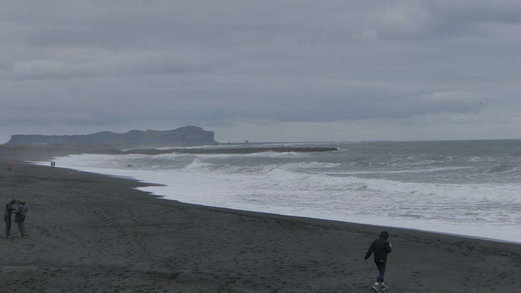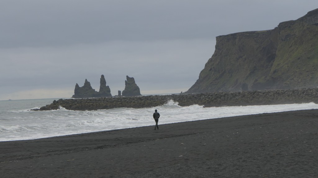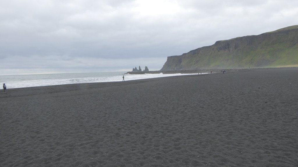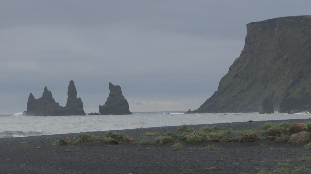 다음에 들른 곳이 Vik(Week)이라는 마을에 있는 흑사장(黑沙場, black sand beach) Vikurfjara(Weekend Beach)이다. 흑사장은 화산폭발 때 흘러내린 용암들이 수천년간 풍화작용에 부서져서 형성된다. 특히 아이슬란드의 경우는 추운 겨울에 얼었다 녹기를 반복하고 북대서양의 거친 파도에 더 잘게 부서졌기에 유명해진 것이다. Vikurfjara에서 서쪽으로 찻길로 약 7 miles (11 Km) 정도 떨어져 있는 Reynisfjara가 사실은 현무암 기둥들과 어우러진 절경으로 더 유명하다. 그런데 그 곳은 해변의 폭이 좁고 예측할 수 없는 거친 파도로 사망을 포함한 안전사고가 빈번하여 우리는 가지 못했다. 이 두 해변이 만나는 부분이 뾰족하게 튀어나온 작은 곶인데 그 앞바다에 Reynisdrangar(Test Boys)라 명명된 sea stacks, 촛대 같은 모양의 현무암들이 있는데 이곳을 대표하는 경치이다. 이 바위들에 대한 전설에 의하면 트롤들이 세개의 돛이 달린 범선을 해가 뜨기 전에 육지로 끌어 올리려다 실패하여 바위로 변했다고 한다.