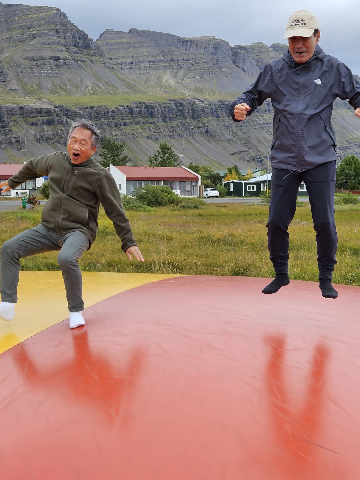 아이슬란드 마을에서 공통적으로 볼 수 있는 것이 있는데 수영장과 트램펄린(trampoline)이다. 특히 트램펄린은 사계절 사용할 수 있는 특수 고무재질로 만들어졌으며 반원통형과 비슷한데 사면에 경사가 있다. 무지개색으로 되어 있어 마을을 지나다 보면 금방 눈에 띈다. 우리도 한번 해보기로 했는데 우선 신발을 벗어야 하고 경사면에서 뛰면 영락없이 미끄러지고 만다.