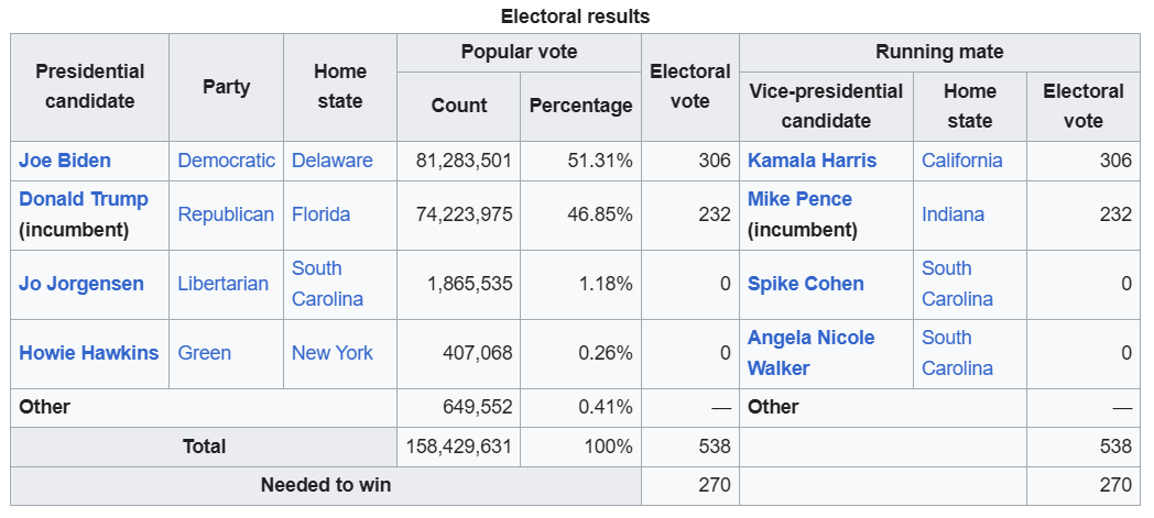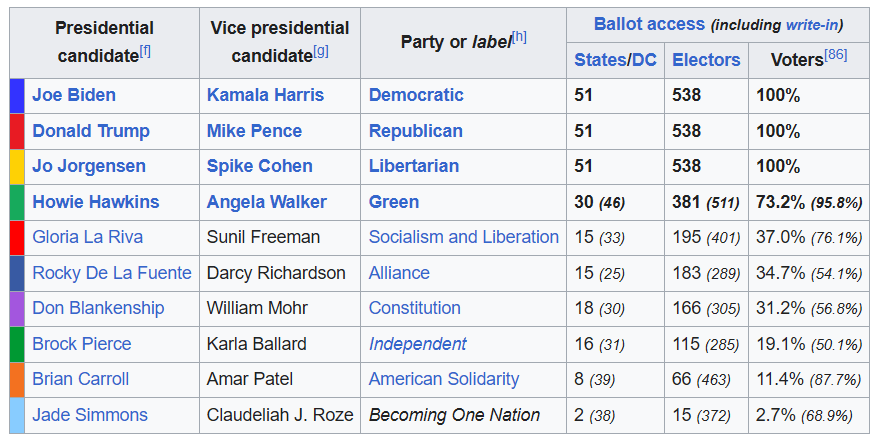 미국 대통령 선거는 양대 정당인 공화당과 민주당의 후보들이 절대적인 주목을 받는다. 그렇지만 대선 후보에는 이름도 모르는 군소정당 후보들이 항상 끼어 있다. 트럼프와 바이든의 대결로만 알고 있는 2020년 대선에 참전한 군소정당은 Libertarian, Green, Socialism and Liberation, Alliance, Constitution, Independent, American Solidarity, Becoming One Nation 등 8개 정당이다. 이런 정당들은, Libertarian을 제외하고, 조직력도 미미하여 DC (District of Columbia) 및 50개주에 후보를 등록도 못 시키는 경우가 많다. 따라서 시작부터 득표할 수 있는 선거인단 숫자에서 핸디캡을 갖게 된다. 이들은 선거인단의 표를 하나도 못 받는 경우가 허다하다. 2020년 대선에 8개 군소정당이 참여하였지만 선거인단 득표는 0표였다. 원래 이길 생각으로 출마하는 것이 아니고 자기들의 이념을 좀 알리고 이름을 내기 위해서 출마한다고 해도 과언이 아니다. 그래서 이런 군소정당의 대선 후보는 선거인단 1표를 받고 3등에 이름을 올려도 2등보다 훨씬 기쁜 것이다.