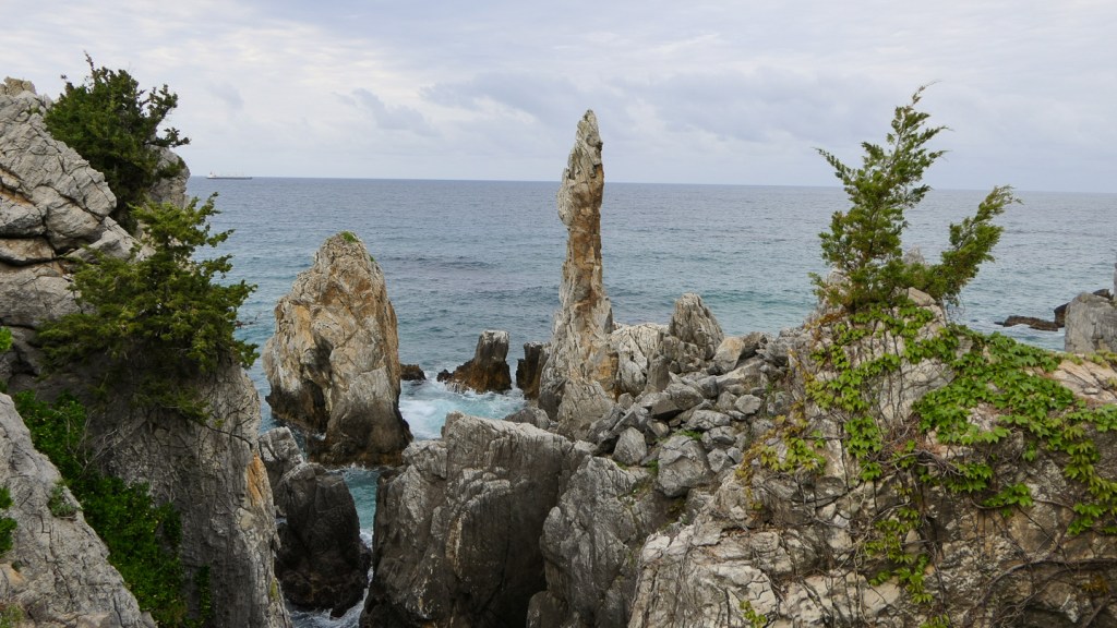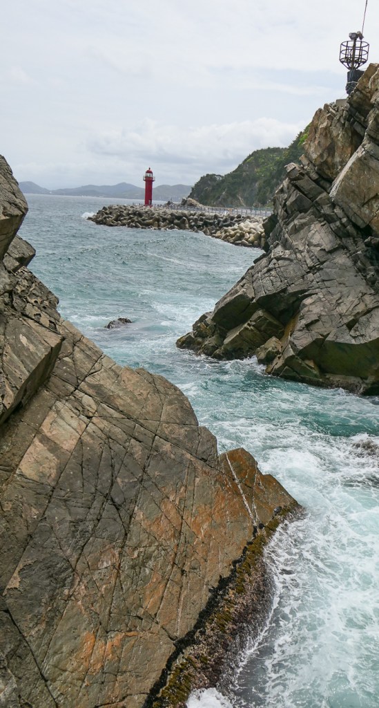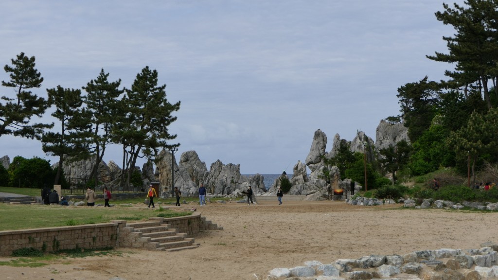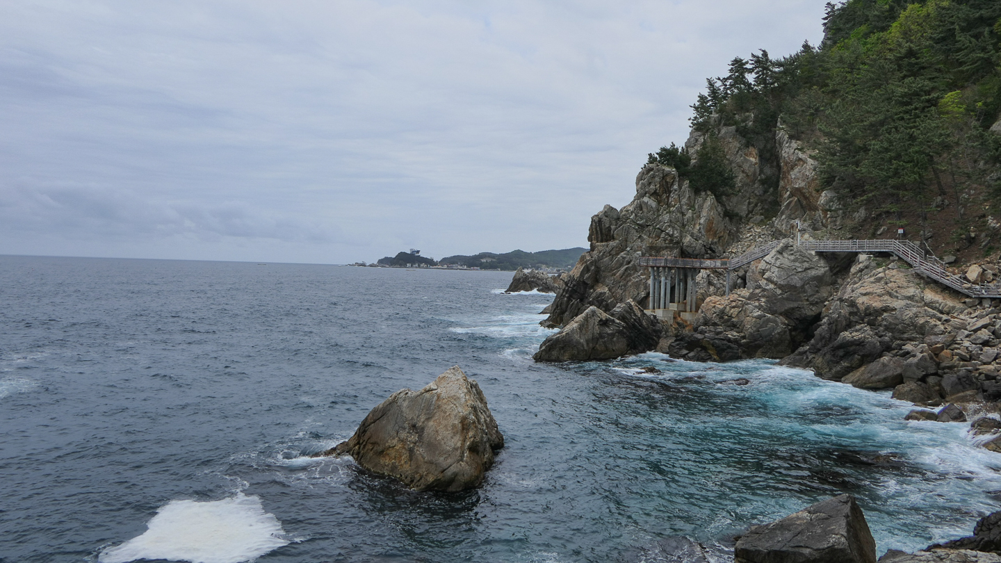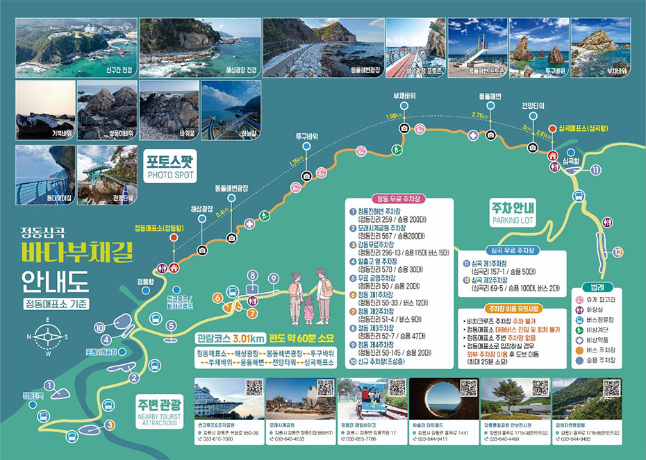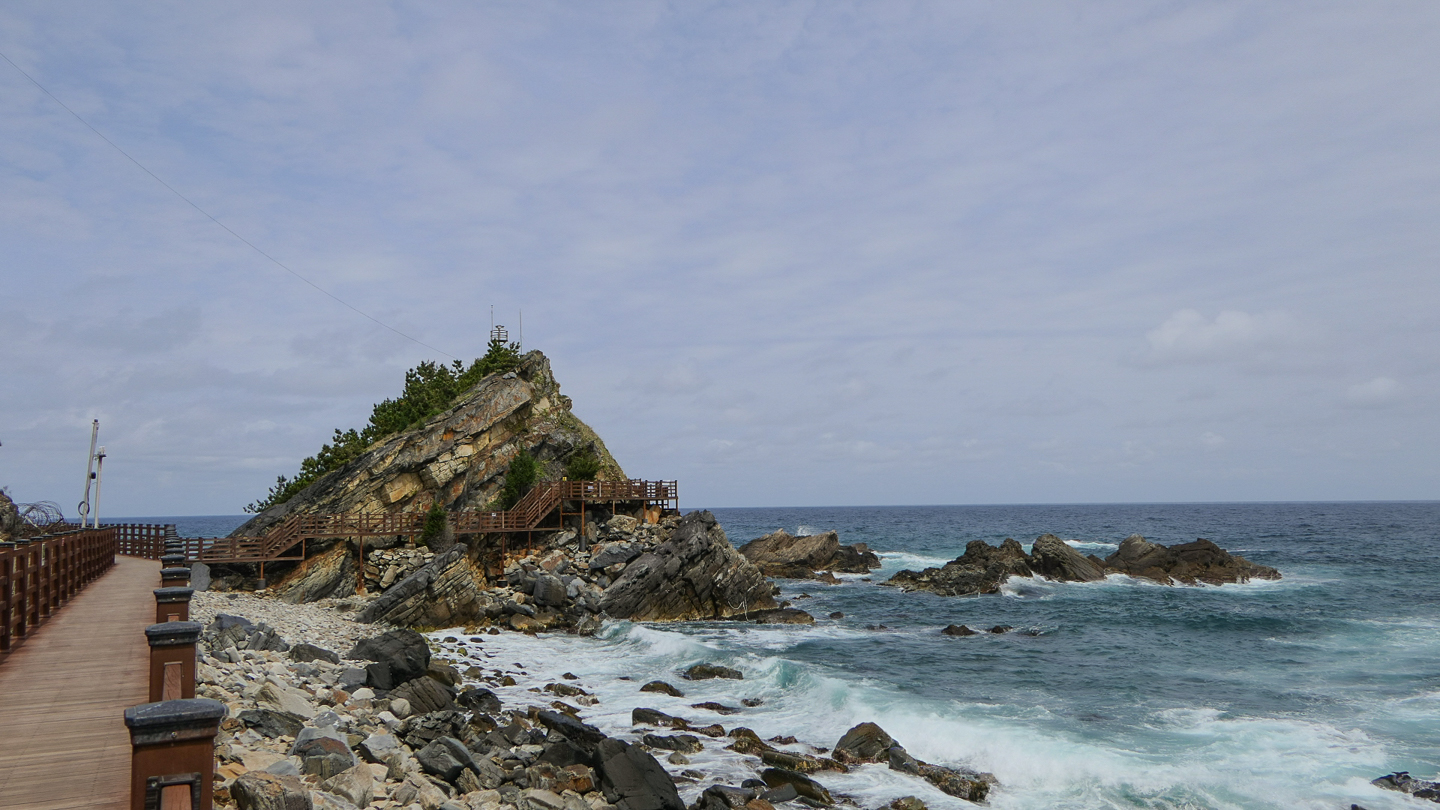 옛날에는 동해 하면 강릉, 강릉 하면 경포대 해수욕장이었다. 그런데 이제는 명소가 너무나 많아서 하루에 다 돌기가 바쁠 지경이다. 우리는 바닷길 몇 군데를 가보기로 하였다. 먼저 들른 곳이 정동심곡 바다부채길이다. 정동진은 강원도 강릉시에 있는 바닷가로 한양의 광화문에서 정동쪽에 있는 나루터라 하여 붙여진 이름이다. 정동진은 신라 때부터 임금이 사해용왕에게 제사를 지내던 곳으로 알려져 있다. 또한 해돋이 명소로 새해 일출을 보러 많은 관광객이 몰리는 곳이다. 정동진항 남쪽에 있는 심곡항은 깊은 골짜기에 있는 곳이라 그런 이름이 지어졌다. 이 두 항구를 연결하는 약 3 Km의 해안 탐방로는 부채 같은 지형을 품고 이어지기에 정동심곡 바다부채길이라는 지명이 선정되었다. 이 일대는 천연기념물 437호로 동해 탄생의 비밀을 간직한 200-250만년 전 지각변동을 관찰할 수 있는 한국 유일의 해안단구이다. 해안단구는 해면과 관련해서 형성된 평탄한 지형면이 해안선을 따라 계단 모양으로 분포하는 지형을 뜻한다. 이 지역은 수십년간 해안경비를 위한 군 경계근무 정찰로로 일반에게 개방되지 않던 곳인데 2017년에 공개되었다. 여러 모양의 바위가 있고 전설이 함께 전해오고 있다. 특히 투구를 쓰고 바다를 지키는 장수의 모습을 닮은 투구바위는 고려시대에 강릉에 부임했던 강감찬 장군의 형상이라고 한다. 설화에 의하면 강릉으로 넘어가는 길인 밤재길에 발가락이 6개인 육발호랑이가 있었는데, 사람이 지나가면 스님으로 변하여 내기바둑을 두자고 하고 이기면 그 사람을 잡아먹었다고 한다. 강감찬 장군이 부임하여 육발호랑이에게 당장 떠나지 않으면 일족을 멸하겠다고 하자 육발호랑이가 두려워 백두산으로 도망하여 더 이상의 피해가 없었다고 한다.