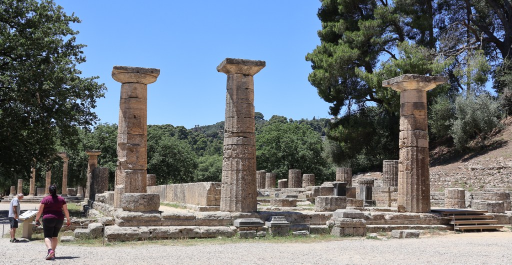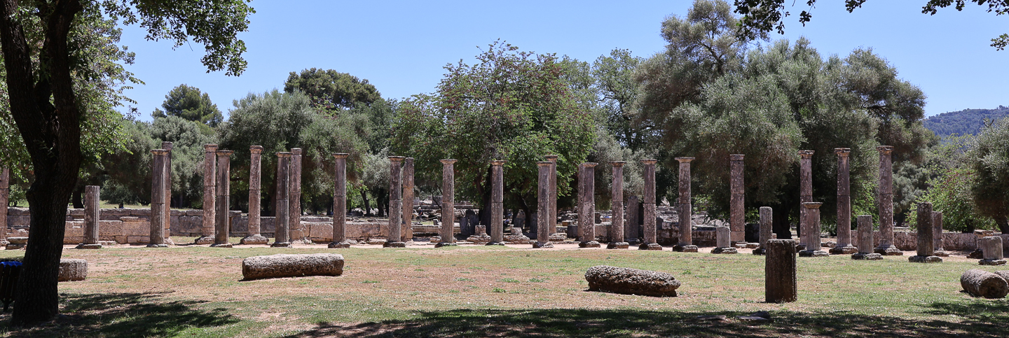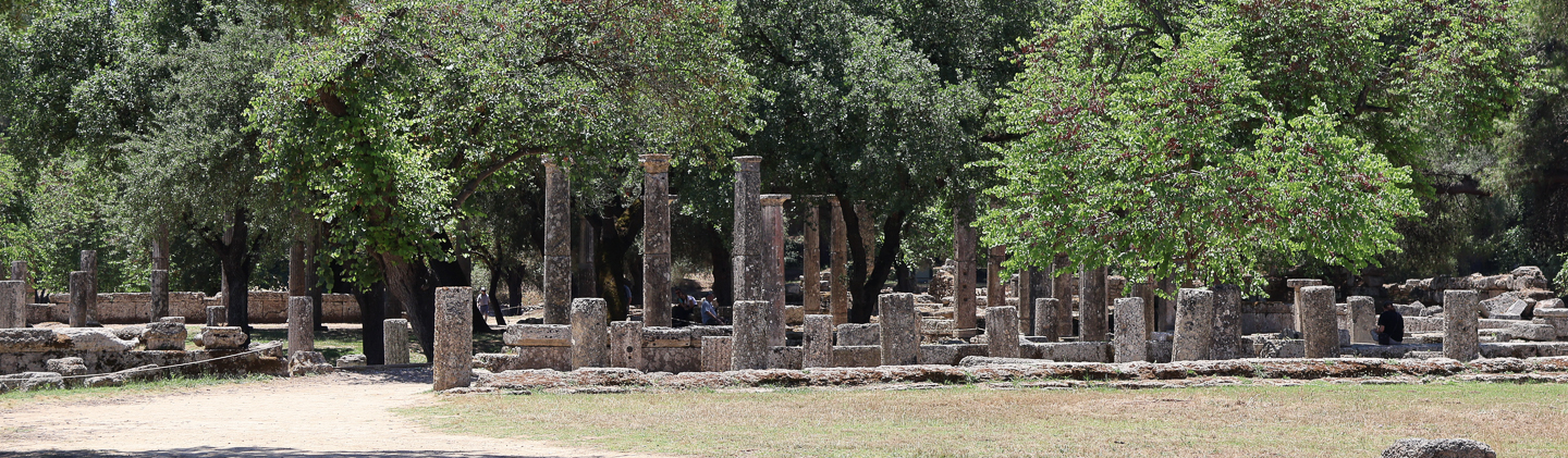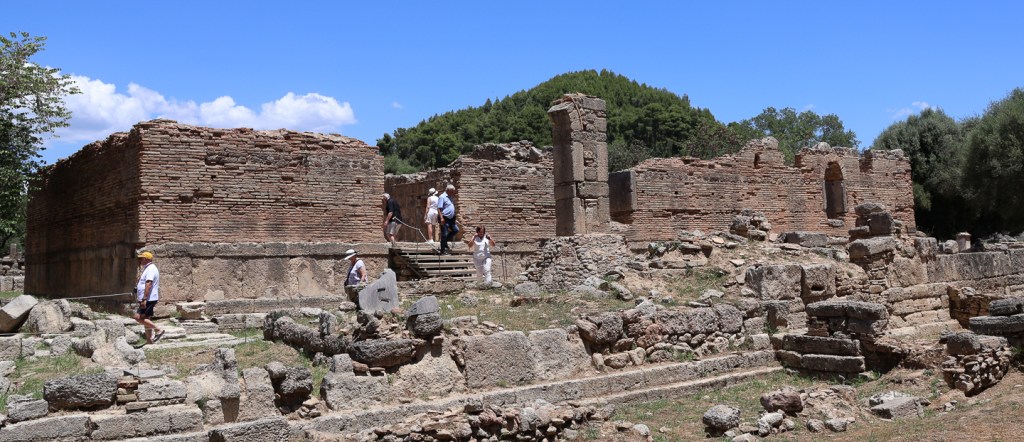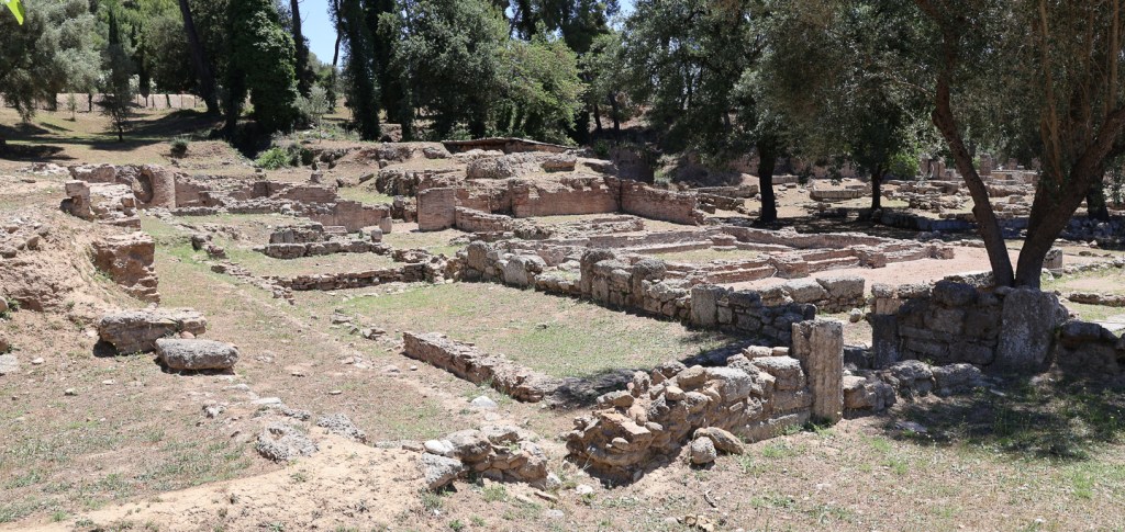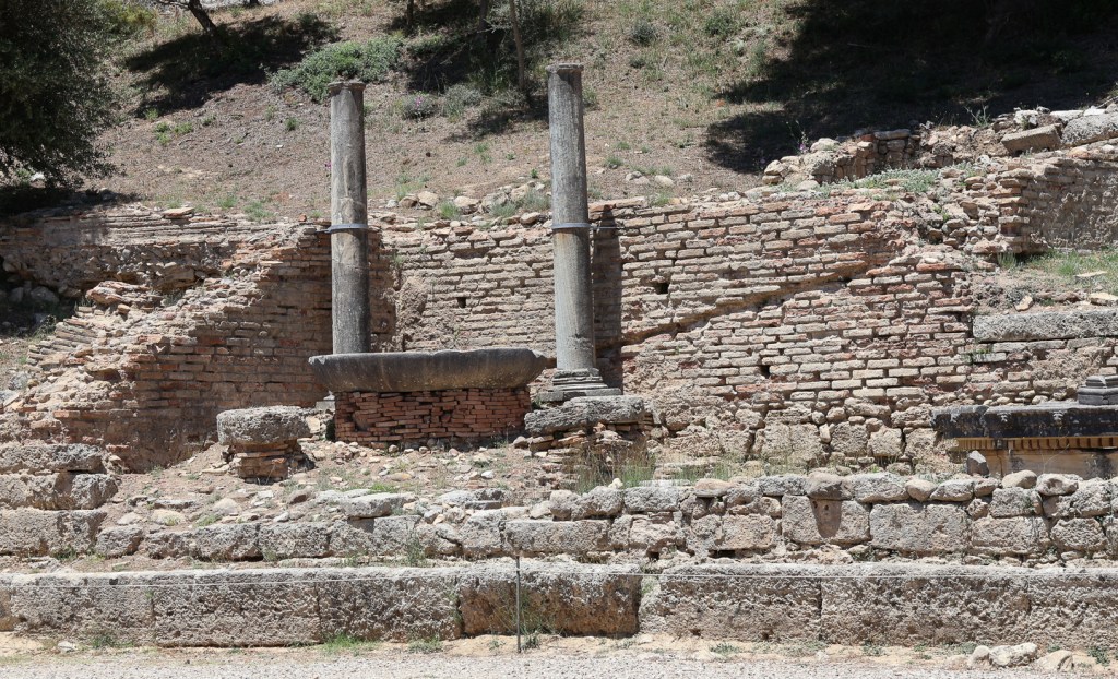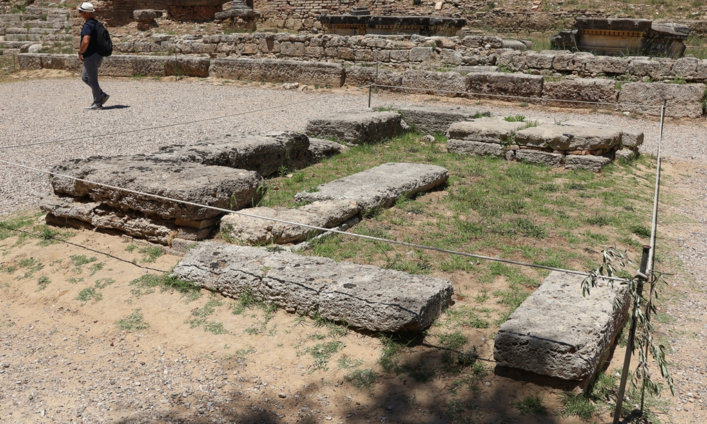 (1) Northwest Propylon, (2) Prytaneion, (3) Philippeion, (4) Temple of Hera, (5) Pelopion, (6) Nymphaeum of Herodes Atticus, (7) Metroon, (8) Treasuries, (9) Crypt – arched way to the stadium, (10) Stadium, (11) Echo Stoa, (12) Building of Ptolemy II and Arsinoe II, (13) Hestia Stoa, (14) Hellenistic building, (15) Temple of Zeus, (16) Altar of Zeus, (17) Ex-voto of Achaeans, (18) Ex-voto of Mikythos, (19) Nike of Paeonius, (20) Gymnasion, (21) Palaestra, (22) Theokoleon, (23) Heroon, (24) Pheidias’ Workshop and Paleochristian Basilica, (25) Baths of Kladeos, (26) Greek Baths, (27) (28) Hostels, (29) Leonidaion, (30) South Baths, (31) Bouleuterion, (32) South Stoa, (33) Villa of Nero, I – XII 보물창고들