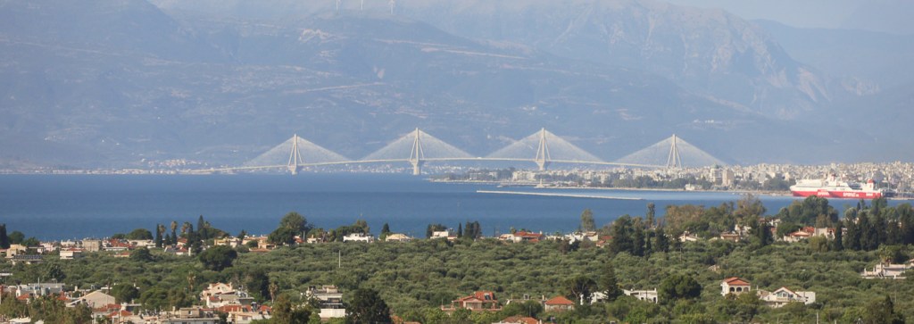그리스 본토에 고린도 만을 끼고 있는 작은 휴양도시 Nafpaktos에 짐을 풀고 리오-안티리오 다리 (Rio-Antirrio Bridge)를 건너 펠로폰네스 반도로 들어갔다. 이 다리의 공식 이름은 하릴라오스 트리쿠피스(Charilaos Trikoupis) 다리이며 펠로폰네스 반도의 Rio와 그리스 본토의 Antirrio를 연결하고 있다. 이 다리는 2004년 아테네 올림픽을 대비해서 개회 하루 전에 개통되었고 성화봉송에 이용되었다. 총 길이 1.48 mile(2.38 Km)로, 이 다리에 관한 그리스 website에 의하면, 세계에서 가장 긴 사장교(Cable-stayed Bridge)이다.