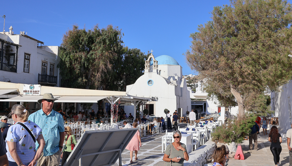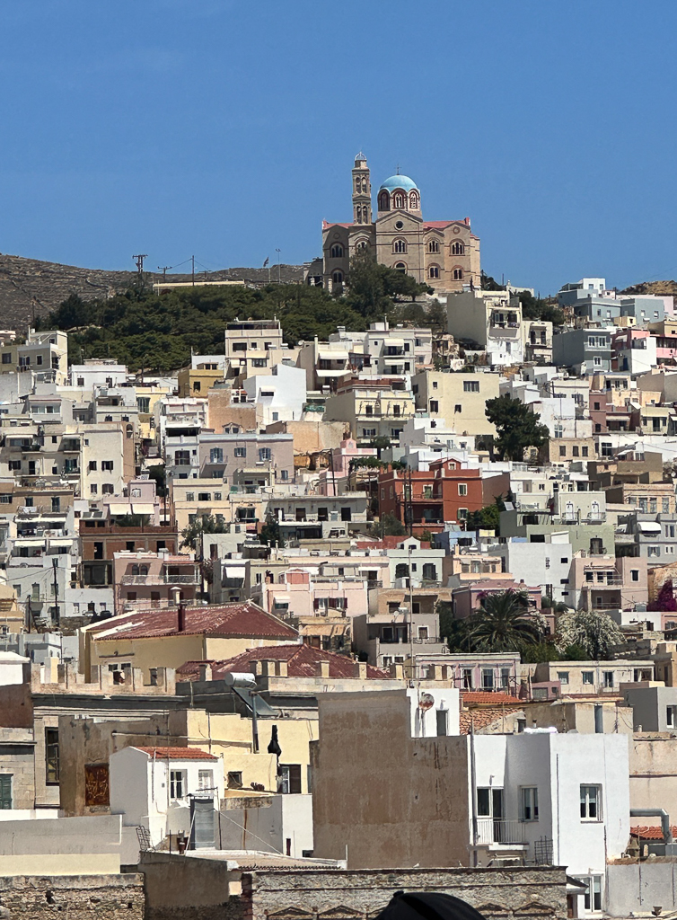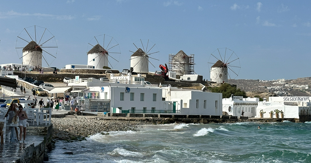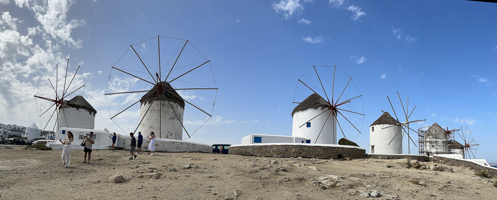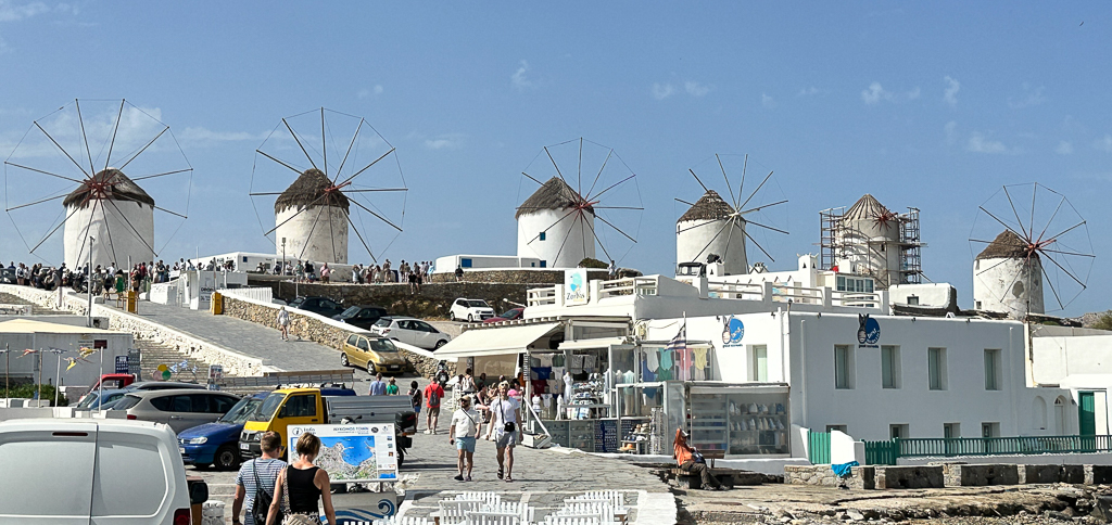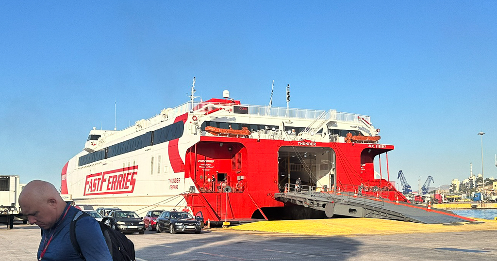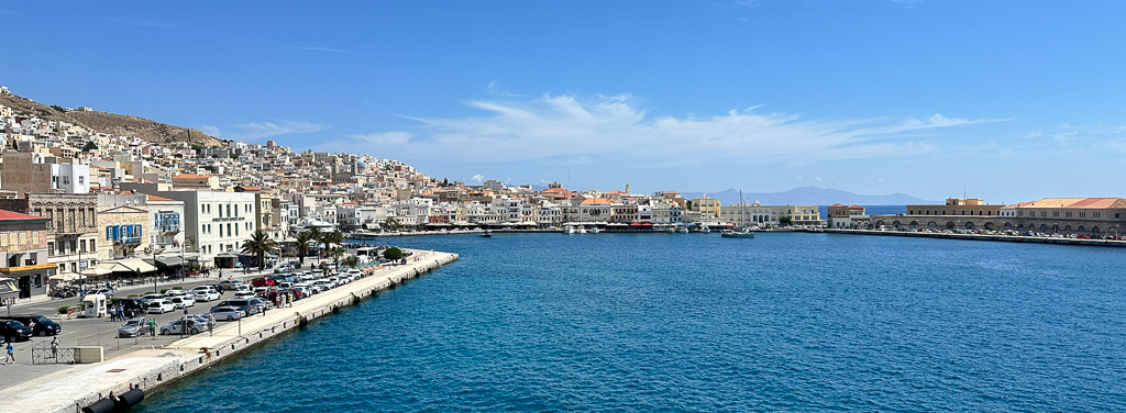 아테네와 미코노스 사이에는 고속 페리가 자주 다니고 약 3시간 20분정도 걸린다. 우리는 Fast Ferries 회사를 이용했는데 중간에 시로스(Syros) 섬에 잠깐 들렸다. 시로스는 아테네에서 남동쪽으로 약 78 mi (144 Km) 떨어져 있으며 면적 32 mi2 (83.6 Km2)로 미코노스 보다 조금 작은 섬이다.