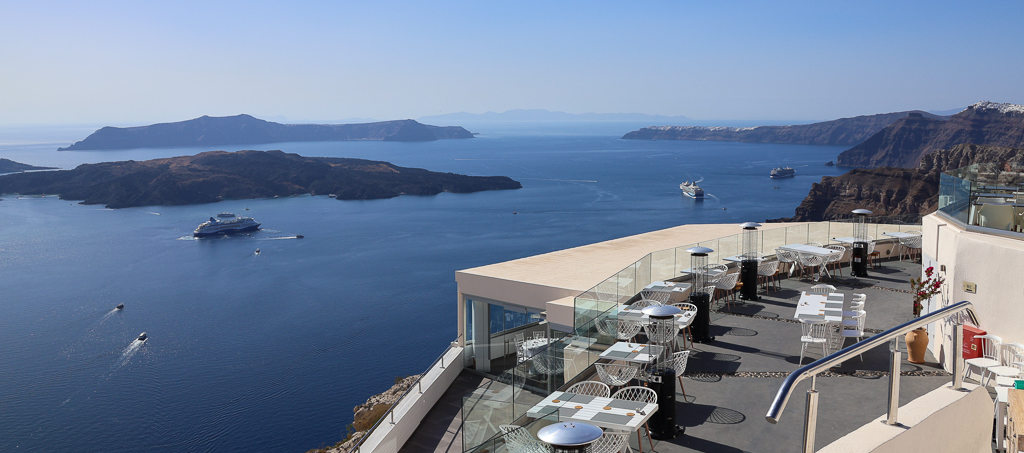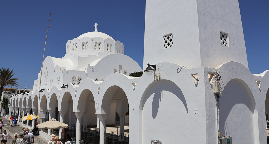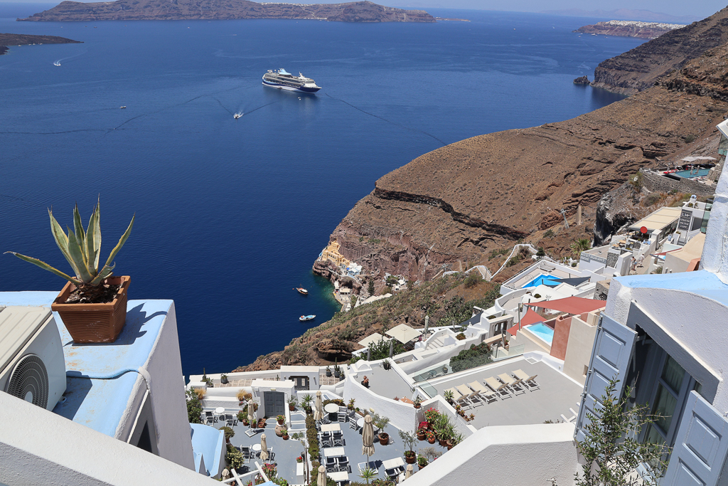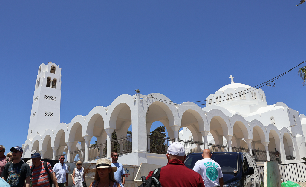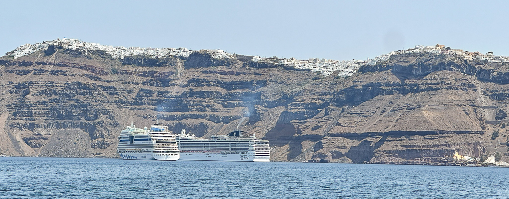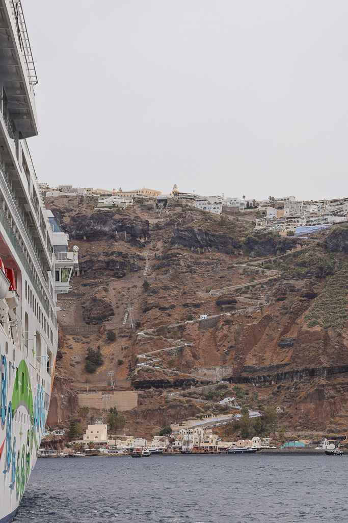 우리는 그리스 관광 후 바로 아드리아해 크루즈를 했는데 미코노스와 산토리니가 중복되었다. 그리스 여행의 여독을 배에서 풀겠다는 생각이었는데 근질거려 잠깐 내렸다. 관광으로 산토리니의 이모저모를 자세히 보았기에 크루즈로 왔을 때는 피라만 슬쩍 들렸고 이 글에 합해서 소개한다. 먼저 관광은 미코노스에서 고속 페리로 2시간 반정도 걸려서 아티니오스 항을 통해 산토리니로 들어왔다. 크루즈는 텐더로 스칼라 항으로 상륙하였다.