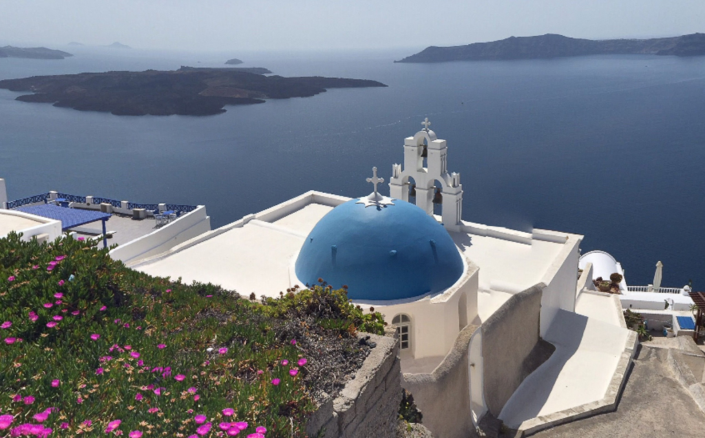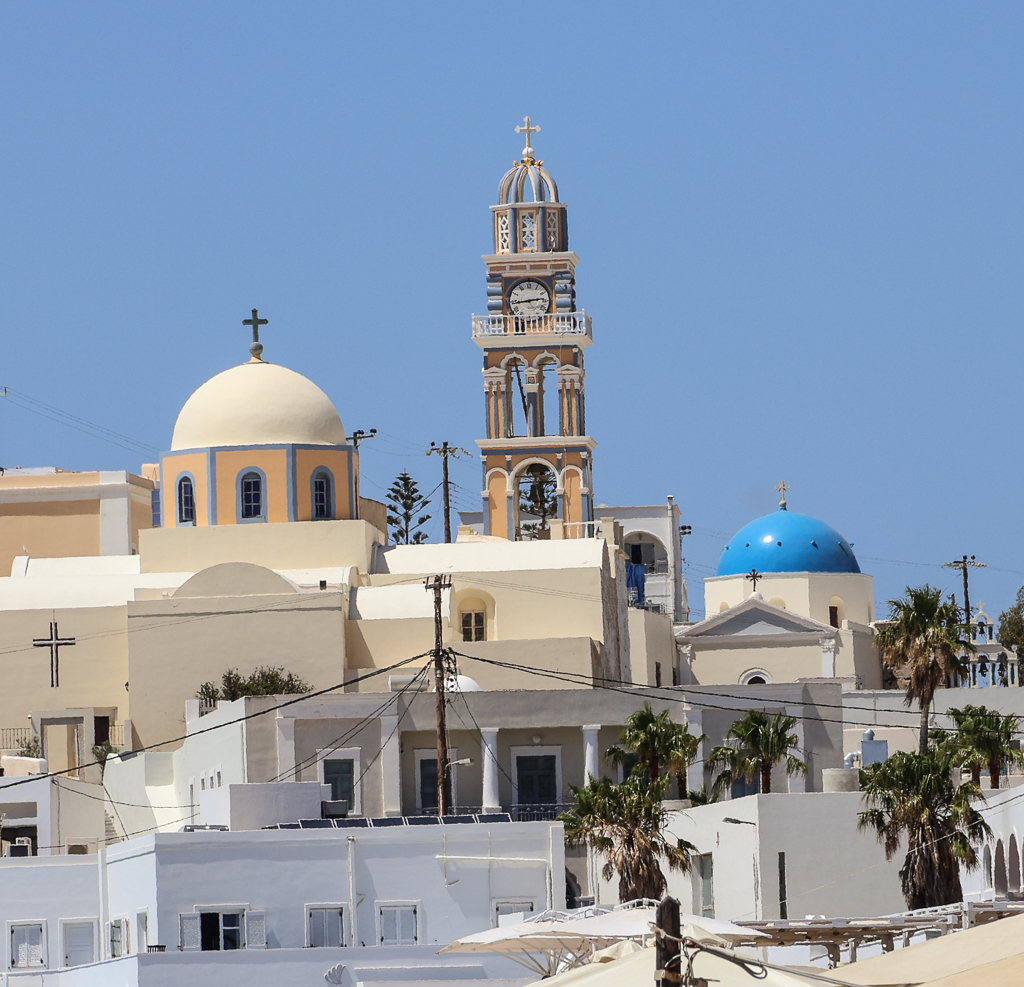산토리니의 척박한 땅과 적은 강수량에도 잘 자라는 Assyrtiko라는 포도종자가 있는데 넝쿨로 기르지 않고 낮은 수풀 같이 재배한다. 넝쿨보다 손이 덜 가고 아침이슬을 최대로 활용하기 위한 수단으로 보인다. 소량으로 양조되는 산토리니 산 포도주는 향기와 단 맛으로 애주가들의 사랑을 받는다고 한다. 산토리니는 화산으로 형성된 독특한 지형과 전반적으로 건조하고 더운 날씨로 연중무휴 관광객들이 찾는 곳이 되었다. 2021년 통계로 인구 15,480명인 이 섬에 연 평균 약 2백만명의 관광객들이 방문하여 근자에는 더 이상 관광객들이 오지 말라는 시위를 주민들이 하였다는 보도도 있다. 산토리니에는 2개의 주 항구가 있다 – 정기운항을 하는 페리를 비롯한 중형 배들을 위한 아티니오스(Athinios) 항과 크루즈 텐더(tender, 정박하지 못하는 대형 배의 승객들을 수송하는 소형 배) 및 소형 유람선을 위한 구 항구 스칼라(Skala) 항. 산토리니에는 관광객이 몰리는 2개의 도시가 있다 – 산토리니의 수도인 피라(Fira)와 피라에서 약 7 mi (12 Km) 북서쪽에 있는 이아(Oia). 피라는 1,313 ft (400 m) 높이의 서쪽으로 기울어진 분화구 절벽위에 세워진 도시로 스칼라 항에서 도보, 당나귀 또는 케이블카로 오거나 아티니오스 항에서 버스로 올 수 있다.