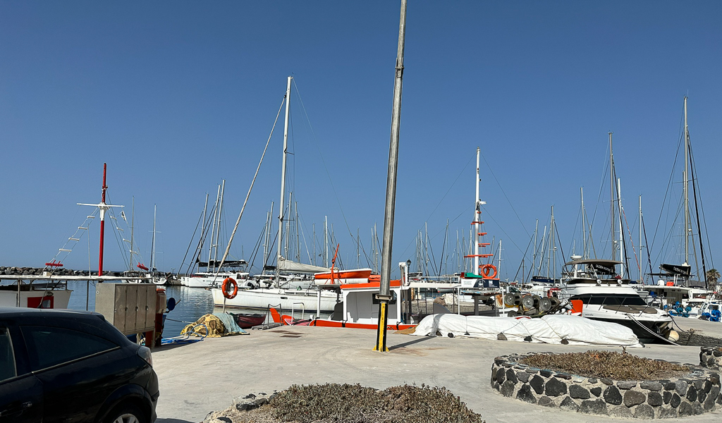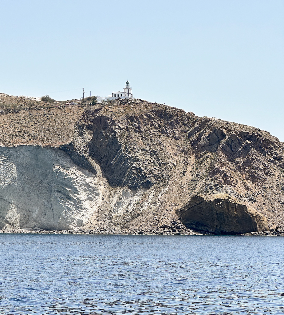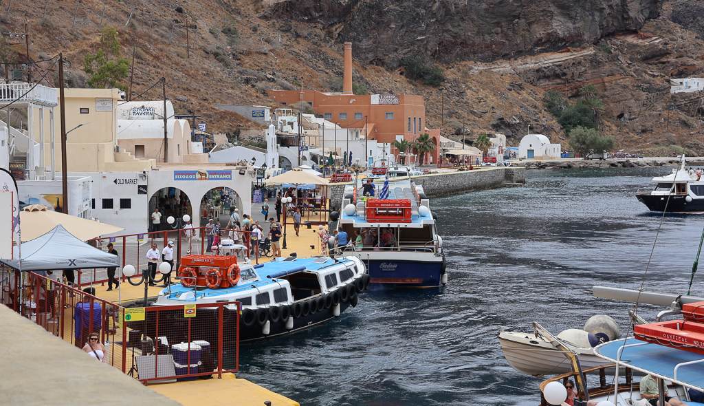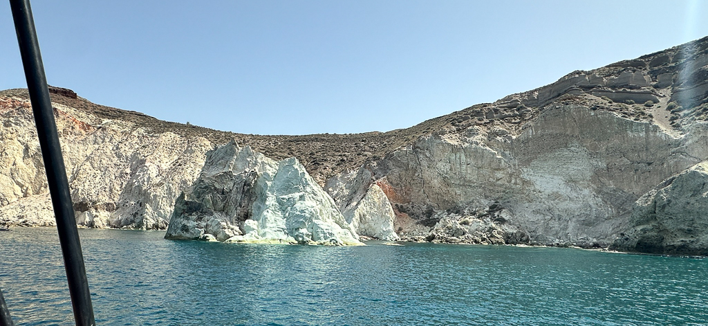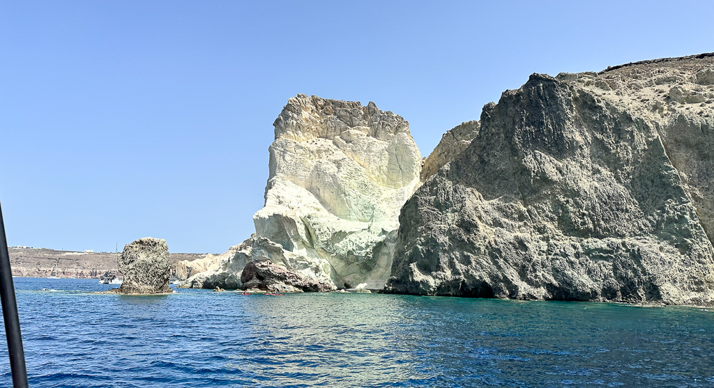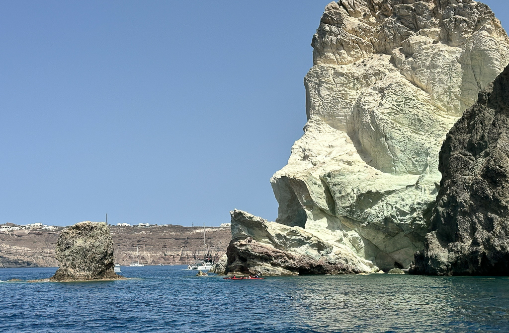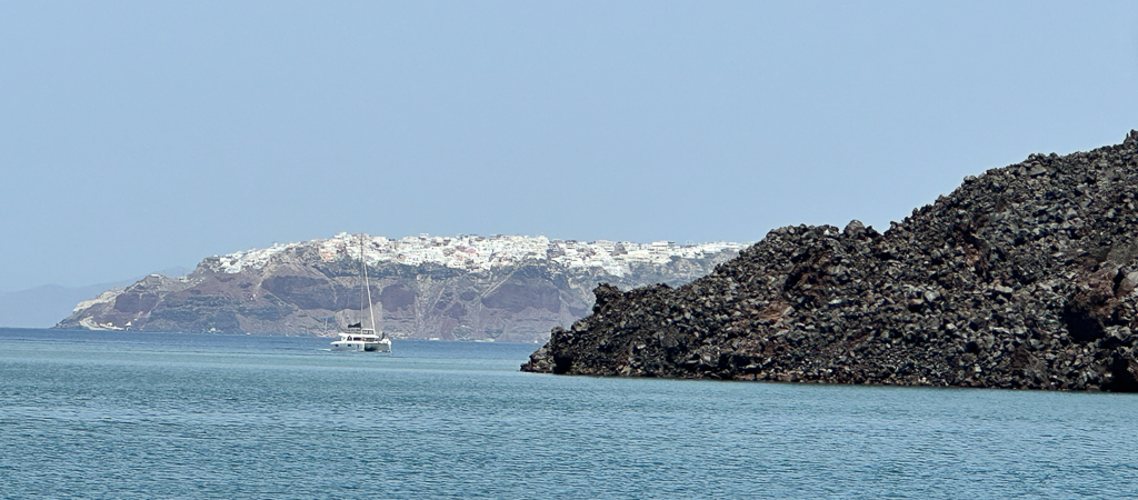 산토리니를 육지에서만 보면 반만 보는 격이라 유람선을 타기로 했다. 산토리니 섬의 남쪽 끝에 위치한 Vlyhada 항구에서 떠나는 캐터머랜(catamaran, 2개의 좁고 긴 선체위에 갑판을 지은 배)을 타고 약 3시간반에 걸쳐 니아 카메니(Nea Kameni) 섬까지 왕복하며 중간에 수영하는 시간과 식사까지 제공하는 알찬 일정이다 – Red Beach, White Beach, Black Beach 및 온천 (바다 밑에서 뿜어 나오는 뜨거운 물이 찬 바닷물과 섞여 미지근하다) 등.