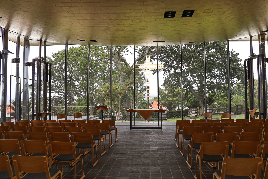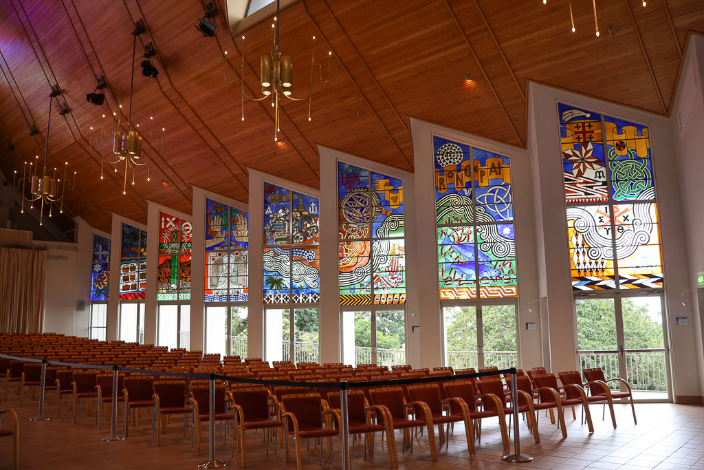 Mountain Fountain – 1981년에 Aotea Square에 설치되었다 2010년에 Holy Trinity Cathedral 앞으로 옮겨진 Terry Stringer의 작품으로 화산을 상징한 분수대.Holy Trinity Cathedral 내부 – stained glass의 영향으로 분홍색의 분위기Great Window – 교회 입구 위에 있는 stained glass 창. 남반구에 있는 stained glass 창 중에 가장 큰 것으로 알려져 있다. 좌우에 있는 창은 유럽에서 온 이주민들과 원주민들의 화합을 주제로, 중앙에 있는 창은 부활하신 예수님을 유럽과 마오리족 관점으로 표현하였다.East Windows – 복음서에 의거한 예수님의 일생을 담고 있다.세례반(洗禮盤) – cast glass 작가 Ann Robinson의 작품연단 위의 중앙 창문Bishop Selwyn Chapel – 1843년에 교회를 짓기 위해 이 곳에 땅을 구입한 당시 주교 Selwyn을 기념하여 2016년에 본당 남쪽에 연결하여 지은 소 예배실1957년에 당시 주교 John에 의해 세워진 주춧돌Selwyn Court – Stephens Ave 건너편에 있는 1865년에 당시 주교 Selwyn의 주거지로 지어진 건물. 원래 이름은 Bishopscourt였는데 1980년에 역사문화재로 등록되며 개명되었다.