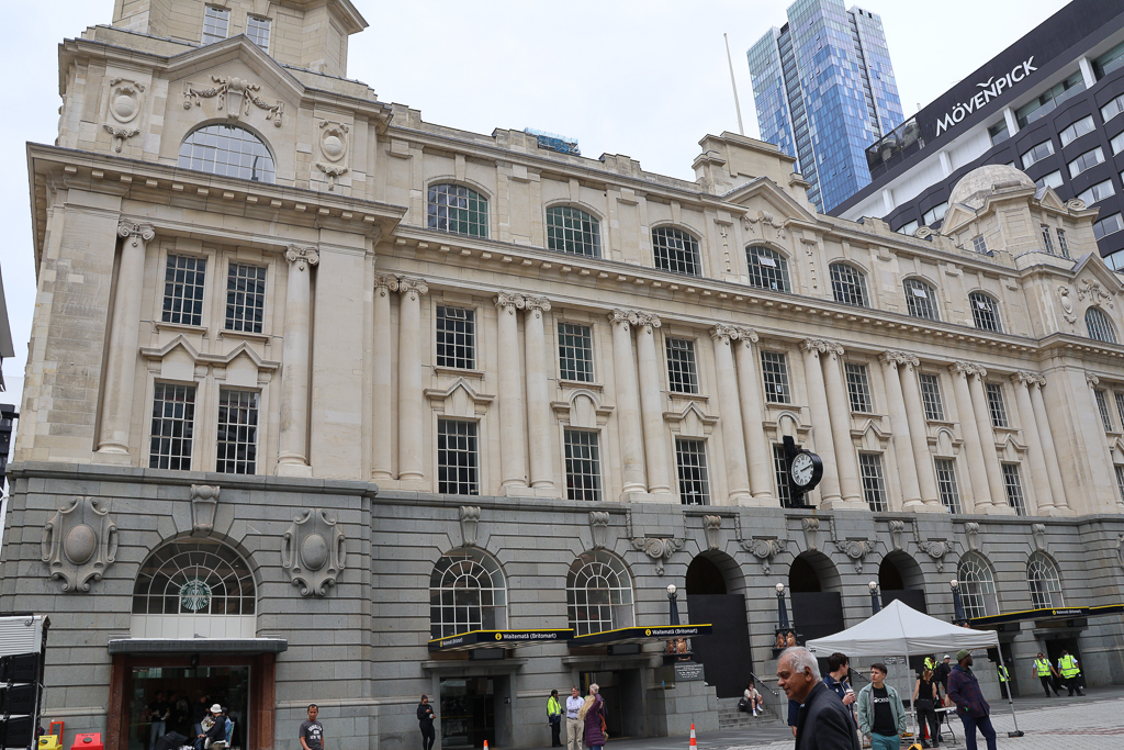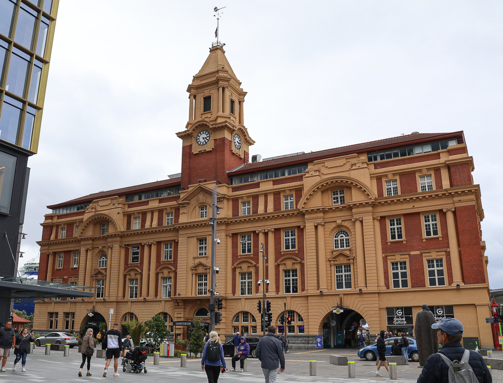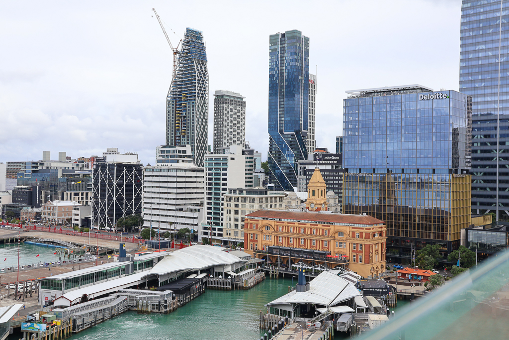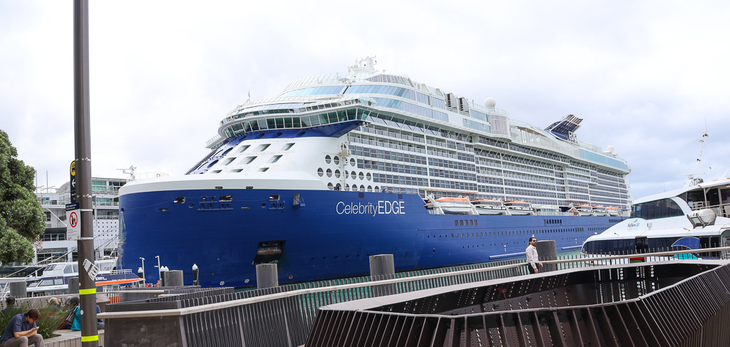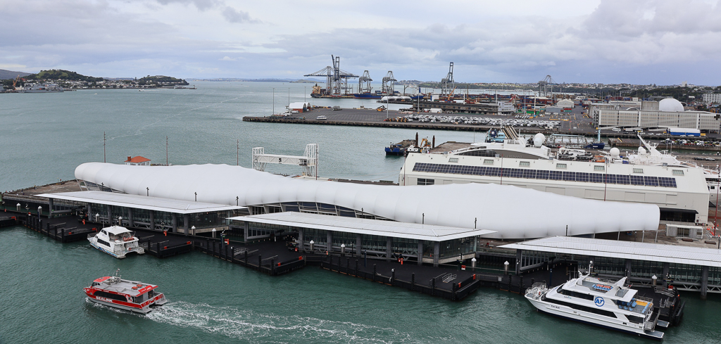 어크랜드 크루즈 항에 정박한 Celebrity EdgeDowntown Ferry Terminal – 가운데 갈색 건물이 원래 터미널 Edwardian Building이고 그 앞 좌우에 있는 흰색 지붕의 건물들이 선착장을 포함한 새 터미널1982년에 새로 지은 페리 터미널Auckland Sky Tower – 배에서 내리면 건물 사이로 바로 보이는 Auckland Sky Tower, 어크랜드의 상징인 1997년에 세워진 높이 1,076 ft(328 m)의 남반구에서 2번째로 높은 건물. 2022년에 자카르타에 Autograph Tower가 세워지기 전까지는 남반구에서 제일 높은 건물이었다. Sky Tower는 진도 8.0의 지진 및 시속 120 mile(200 Km)의 강풍에 견딜 수 있도록 설계되었다.Edwardian Building – 1912년에 완공된 Downtown Ferry Terminal. 새로 페리 터미널을 지은 후 지진보강공사 후 1988년부터 상가건물로 사용되고 있다.A Maori Figure In a Kaitaka Cloak, Molly Macalister, 1967 – 예복 Kaitaka Cloak을 입고 깃털 귀걸이 및 몽둥이 mere를 들고 있는 마오리 추장의 동상. 3년간 여러 의견을 취합하여 만든 동상으로 Edwardian Building에서 Quay Street 건너편에 있다. 제작과정에 관한 자세한 기사Heritage Mooring Bollards Red Fence – 부둣가에 있는 길 Quay Street과 선착장 사이에 있는 빨간색의 철제 울타리와 가로등Britomart Train Station – 2003년에 세워진 지하철 및 버스역의 종합 터미널Britomart Train Station 앞 광장에 있는 Christmas Tree
