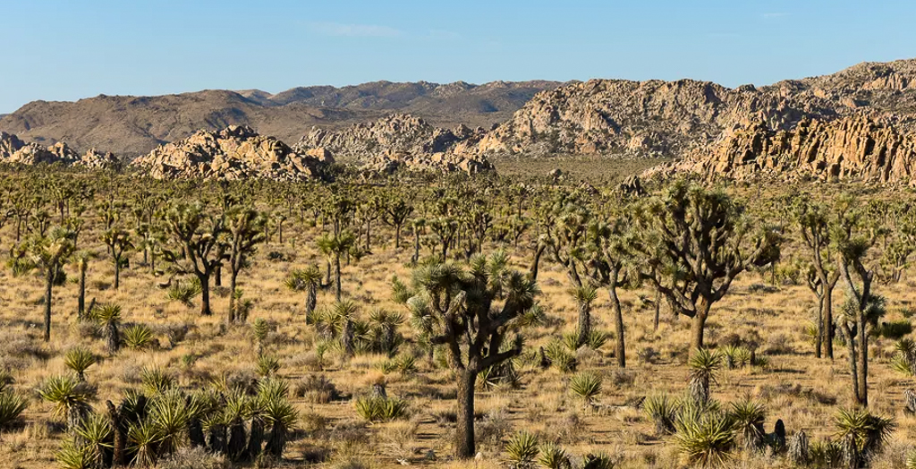 조슈아 트리 국립공원은 Los Angeles에서 동쪽으로 약 130 mi (210 Km) 떨어져 있으며 Palm Springs에서는 약 45 mi (72 Km) 동쪽에 있다. 이 일대는 1936년에 국정기념물(National Monument)로 지정되었고 1994년에 국립공원으로 승격되었다. 모하비 사막(Mojave Desert)과 콜로라도 사막(Colorado Desert)을 부분적으로 포함하고 있어 사막성 생태계를, 그 중에도 조슈아 트리가 군집해 있어서 유명해졌다. 기후변화 및 산불 등의 영향으로 21세기말에는 개체수가 90% 정도 감소할 것이라는 보고서가 발표되었는데, 그렇게 심각하지는 않다는 연구결과도 있다. 여하간 California 주는 조슈아 트리 보호대책에 나섰다. 조슈아 트리는 Yucca 종에 속하면서 야자나무와 같은 특성을 갖고 있어 Yucca Palm, Tree Yucca 또는 Palm Tree Yucca라는 별명으로도 불린다. 나이테가 없어서 나이를 정확히 측정할 수는 없지만 수백 년을 사는 것으로 알려져 있다. 이 나무의 이름은 이 지역에 살던 원주민들이 부르던 것에서 19세기경부터 조슈아 트리로 바뀌었는데, 모르몬 교도들이 사막을 지날 때 이 나무를 보고 길을 찾았다 하여 성경에 나오는 여호수아의 이름으로 부르기 시작한데에 연유되었다고 한다. 조슈아 트리 국립공원은 각가지 모습을 한 거대한 바위 덩어리들로도 유명하다.