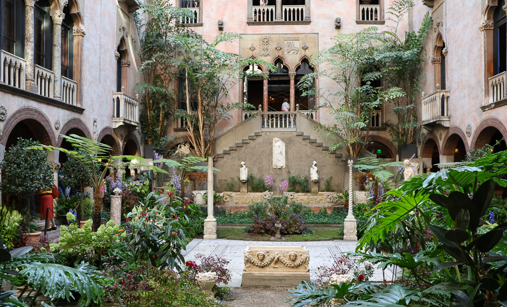 Isabella Stewart Gardner Museum안뜰, Isabella Stewart Gardner Museum안뜰, Isabella Stewart Gardner Museum안뜰, Isabella Stewart Gardner Museum안뜰, Isabella Stewart Gardner MuseumEl Jaleo, Spanish Cloister, Isabella Stewart Gardner Museum – John Singer Sargent의 1882년 Andalusian dance를 주제로한 유화Retable with Scenes of the Passion, Joinville-Vignory Workshop, 1425년경, Isabella Stewart Gardner Museum – 예수님의 수난을 주제로 석회암을 조각하여 만든 제단 뒤의 선반, 왼쪽부터 세례 요한, 가룟 유다의 입맞춤, 채찍질, 십자가를 지신 예수님, 십자가에 달리신 예수님, 유대인들의 고발, 무덤에 간 3여인, 성 캐더린 (St. Catherine: 4세기경에 Roman Egypt의 Alexandria에서 순교한 성인)Guardians of the Museum, Isabella Stewart Gardner Museum – 16세기초에 독일에서 제작된 고대 로마의 병정이었던 두 성인의 목각상, 왼쪽이 George 오른쪽이 Florian.Blue Room, Isabella Stewart Gardner Museum – Gardner 생전에 음악회 손님들, 특히 여성들을 위한 응접실이었다. 지금은 Gardner와 친했던 예술가들의 작품이 전시되어 있다.Tapestry Room, Isabella Stewart Gardner Museum – 중세 유럽의 성에 있는 연회장을 연상시키며 음악회 연주장으로 쓰였다. 10장의 tapestry가 벽을 장식하고 있고 fireplace 위에 있는 15세기경에 그려진 성 (또는 천사장) 미가엘의 그림이 돋보인다.Early Italian Room, Isabella Stewart Gardner Museum – Gardner는 유럽 특히 이태리를 사랑했으며 이태리의 고딕 및 르네상스 풍의 예술품을 수집하였다. 그 중 하나인 14세기초에 Simone Martini의 금박을 이용한 tempera 화법의 Virgin and Child with Saints. 아래에 같은 화법의 Francesco Peselino의 15세기 작품 The Triumphs of Love, Chasitity, and Death.Virgin and Child, Long Gallery, Isabella Stewart Gardner Museum – 19세기말에 제작된 15세기 Antonio Rossellino의 대리석상 모작. 캐노피는 16세기 이태리 벨벳 제품Lamentation over the Dead Christ, Long Gallery, Isabella Stewart Gardner Museum – Giovanni Della Robbia의 16세기초 terracotta 작품Dutch Room, Isabella Stewart Gardner Museum – 1990년에 도난당한 Rembrandt의 1633년 작품 A Lady and Gentleman in Black이 걸려있던 액자Rembrandt 자화상, Dutch Room, Isabella Stewart Gardner Museum – 23살이던 1629년에 그린 자화상Edge of Garden이라는 주제로 열린 Ming Fay 특별전, 6/26/2025 – 9/21/2025, Isabella Stewart Gardner MuseumEdge of Garden이라는 주제로 열린 Ming Fay 특별전, 6/26/2025 – 9/21/2025, Isabella Stewart Gardner MuseumTree House Residence Hall – Isabella Stewart Gardner Museum에서 Huntington Ave. 건너편에 있는 특이한 건물 MCPHS (Massachusetts College of Pharmacy and Health Science) 기숙사