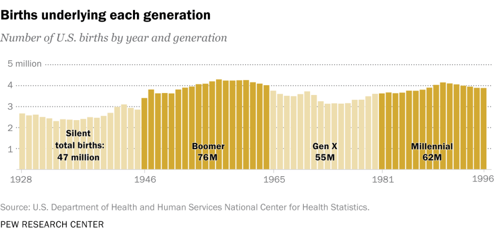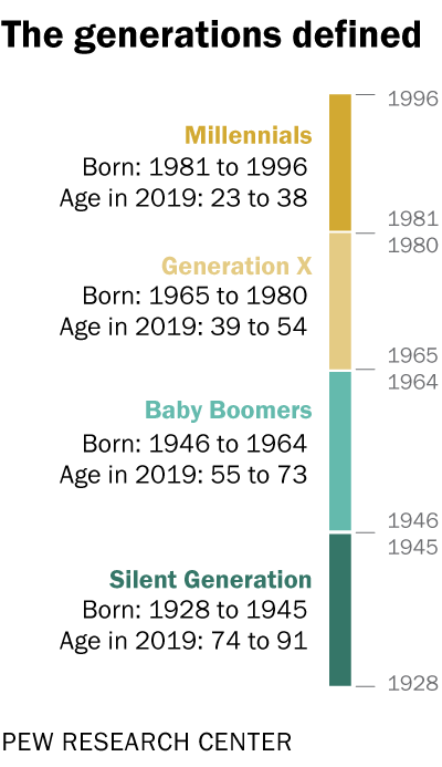 미국에서는 어떤 세대를 일컬을 때 특별한 별명으로 부르기에, Pew Research Center의 세대에 관한 글 및 다른 문헌들을 참고하여 정리해 보았다. 각 세대의 이름이나 출생시기는 과학적인 근거에 의한 것이 아니며 명확가게 구분할 수는 없다. 학자들이 사회적 경향과 추이를 관찰하며 눈에 띄는 변화가 있을 때 공통점을 세대로 요약한 것이다. 각 세대의 특성은 그들이 청장년기에 경험했던 또는 보였던 현상들을 정리한 것이다. 서방 국가에서 비슷한 또는 같은 별명을 사용하지만 출생연대나 의미 및 특성이 약간 다르기도 하다. 이글은 미국의 경우만 열거한다. 한국의 경우는 미국식을 쓰기도 하고, 미국식을 섞어서 발명(?)한 별명도 있고, 복잡하게 ‘386’ 식으로 숫자로 부르기도 한다. 후자의 경우 억지로 끼워 맞춘 느낌이 들고 이제는 널리 사용되지 않는 표현이라 느껴진다.